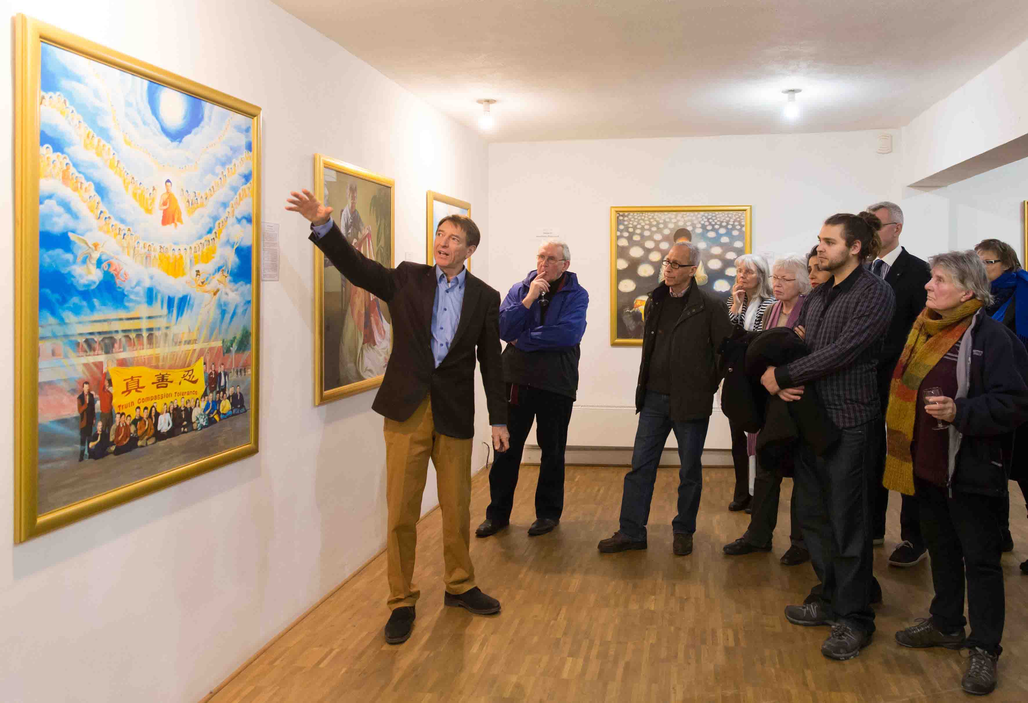 随后,解说员带领前来观展的客人们浏览了美展的七个主题。这些画作出自不同背景的法轮功学员之手。它们表现了中国传统理念,对神佛的赞美,以及修炼人在遭受邪恶迫害中的表现。人们在赞扬画作的艺术水平之余,纷纷表达自己内心的感动。