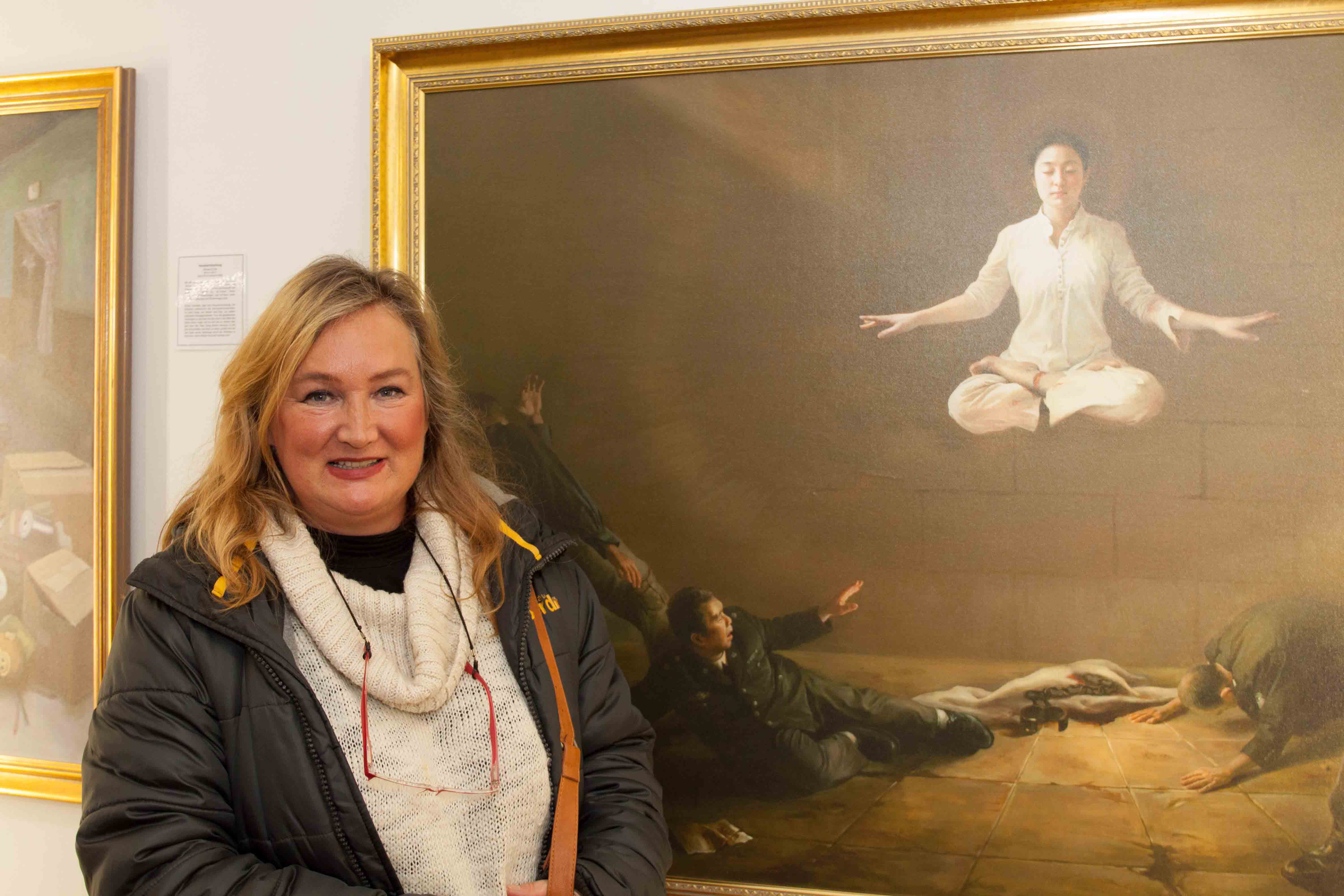 乌特•安格尔丝(Ute Engels)女士是位艺术家。在一家商店里她偶然得到一张传单。她完全不知道等待她的是怎样的画展。她向记者表示:“这个画展各部分规划的很好,观众很容易理解法轮功。每一幅画叙述了一个引发思考的故事。部分画作非常感人。特别是有关于(法轮功学员)受酷刑的内容,非常触动我。”