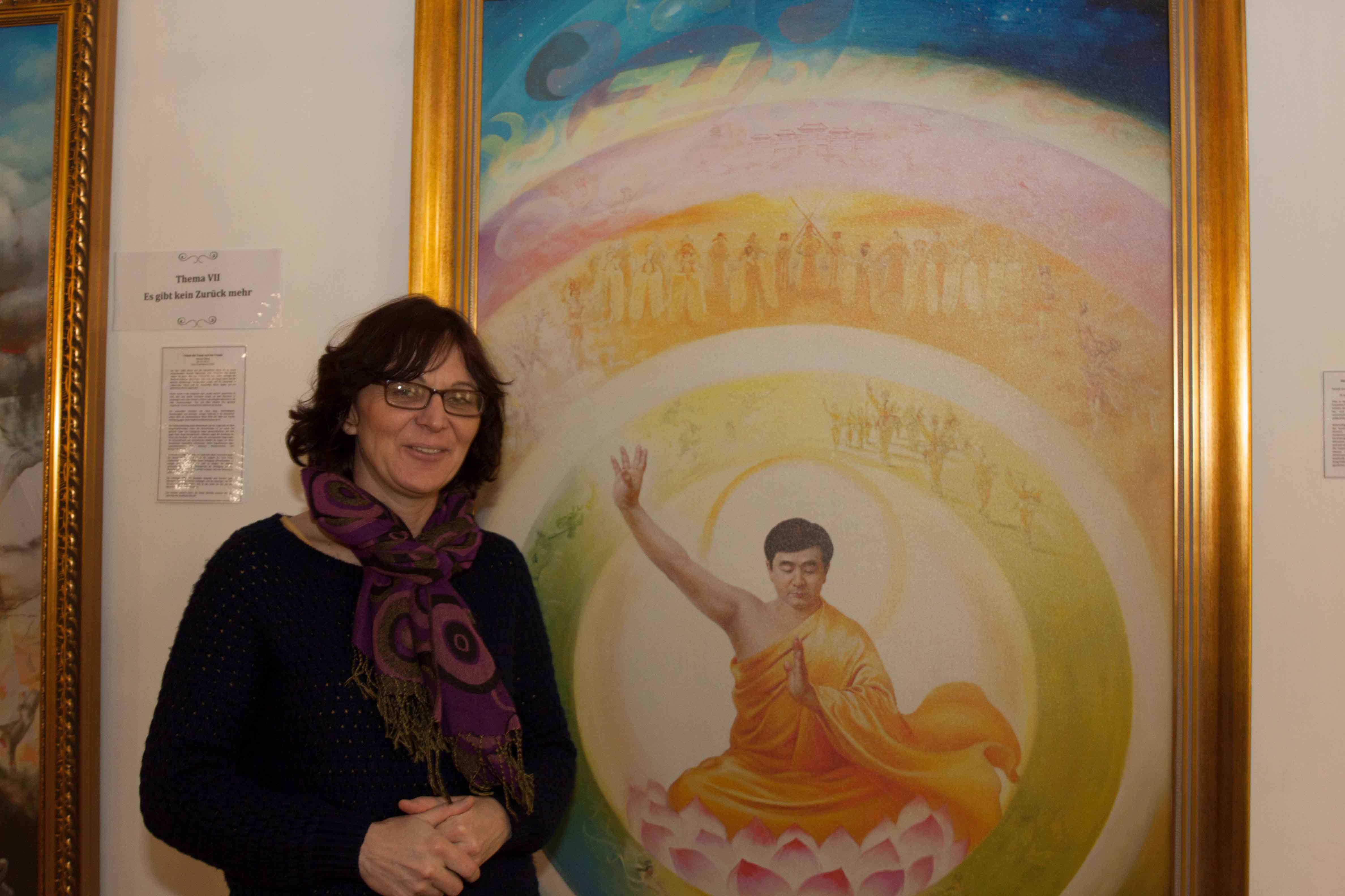 尤兰达在此之前已经通过媒体对法轮功遭受的迫害略有所闻。“今天我的脑海中有了一幅画面——真善忍的原则,绝对的美丽和罕见。(没有想到)时至今日还有人提及它。在欧洲,这是佛教徒标榜自己的口号,而实际上他们做的……我们现今在街上看到的他们的作为,离这个原则太远了。”她继续说:但是在这个画展中,我能感受到这些画家非常严肃对待他们的原则。而且,能非常清楚感受到这个画家经历了什么。
