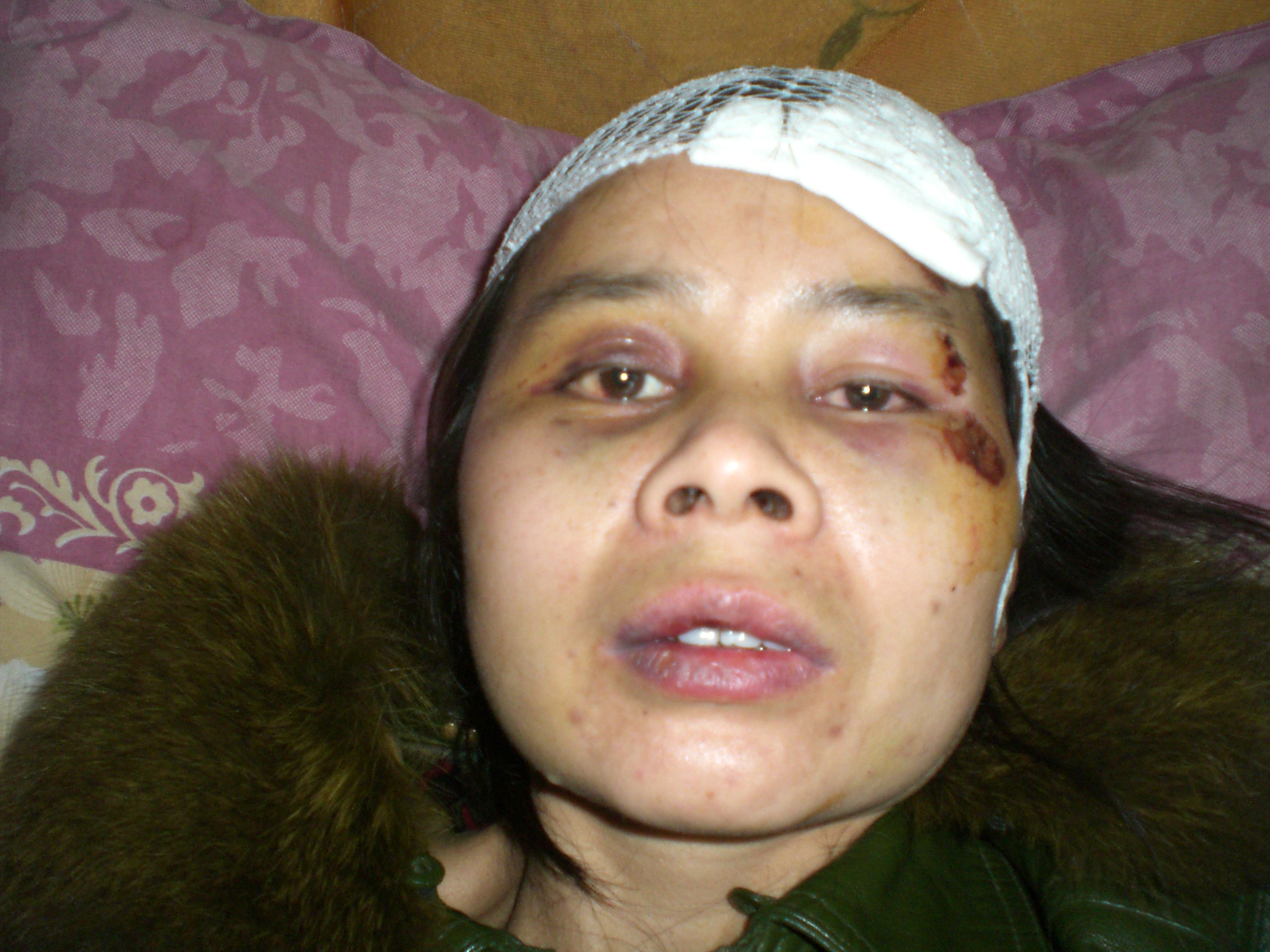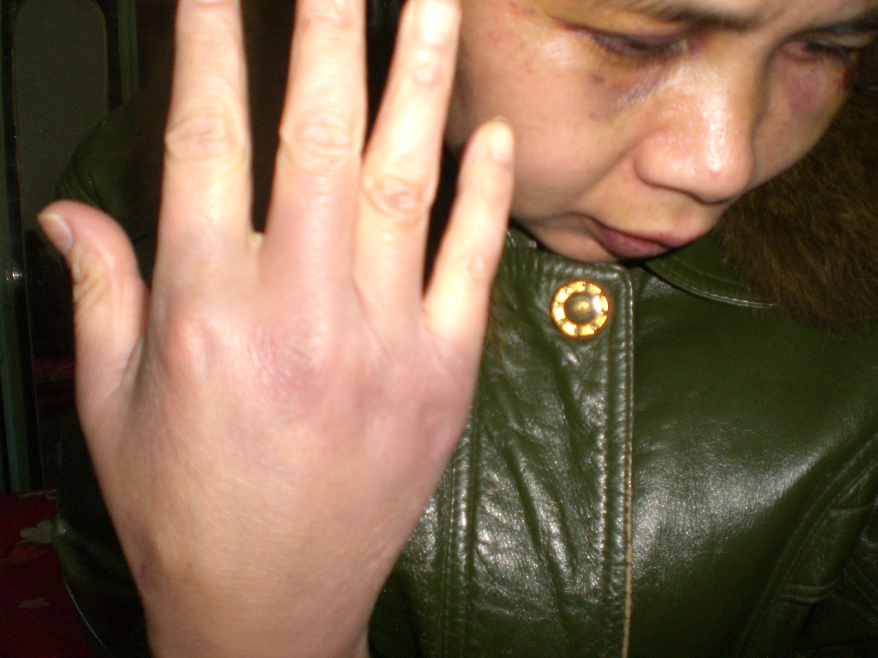 ![]() 杨兰珍在洗脑班被打后脸上留下的瘀伤 | ![]() 杨兰珍在洗脑班手被打肿 |