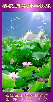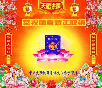 值此二零一五年中国新年即将来临之际,中国大陆铁路系统全体大法弟子恭祝至尊至上慈悲伟大的师尊新年快乐!感谢师尊对我们的慈悲苦度!在师尊的慈悲呵护与加持下我们逐渐走向成熟,弟子们所拥有的一切都溶汇着师尊巨大的付出与承受,对师尊的感恩无以言表。我们只有珍惜这万古机缘,珍惜这所剩不多的助师正法时间,增强凝聚力,整体圆容配合,做好三件事,救度更多的世人,满载众生随师还。