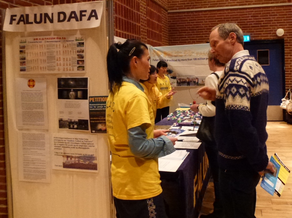 ![]() 丹麦法轮功学员参加奥登塞市健康博览会,用多种语言讲真相。 |