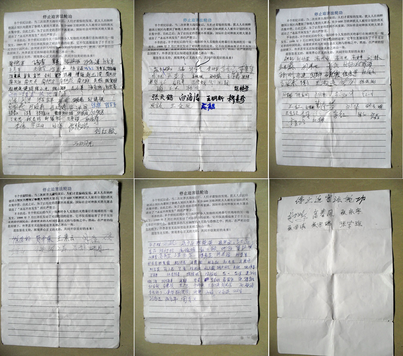 在法轮功学员征签中,一中年男士签完后才看的征签词,说:只要是法轮功征签,签多少回我都签,我就应该签,我非常支持法轮功、支持正义。公安系统一局级干部:在法轮功学员跟前大骂共产党、江泽民是个大坏蛋、更是个大笨蛋,不该迫害法轮功。一政府官员说:你帮我签上吧,我支持你们。
