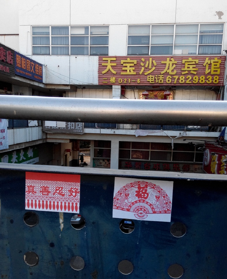 【明慧网二零一五年二月十九日】在2015羊年新年降临之际,在北京某商业街上,人们惊喜地发现,充满节日喜气的中华传统剪纸,携带着“真善忍”“法轮大法”的祥和之气,悄然出现在商家店铺的门窗、墙体和栏杆上,向佳节中的人们传达着祝福,也启迪善良民众珍惜良机,早日得救。
