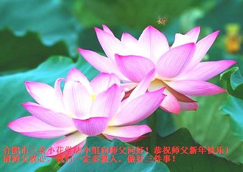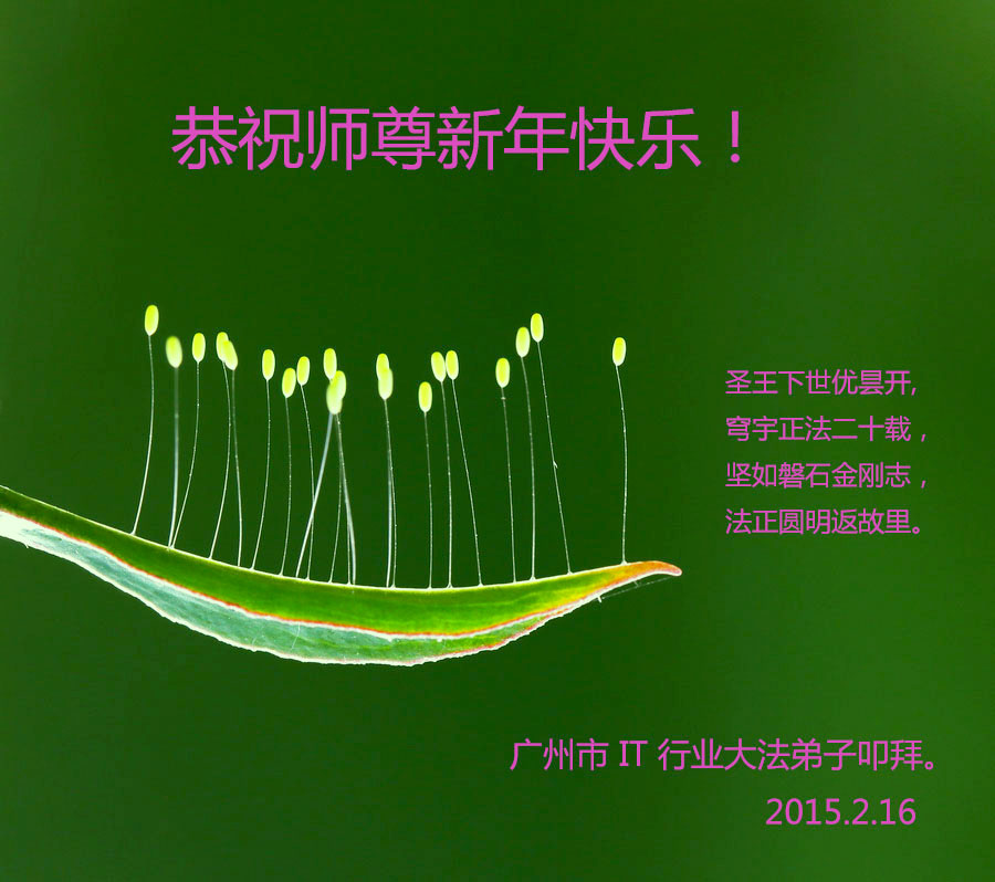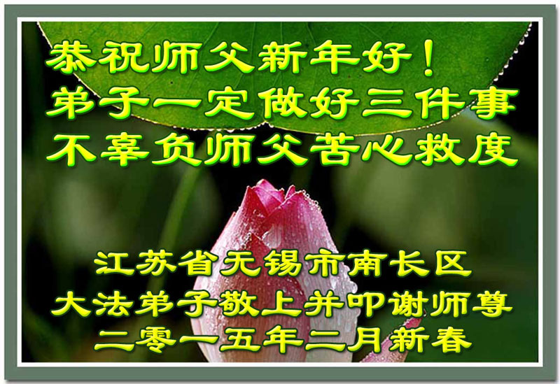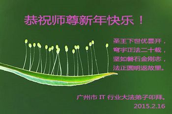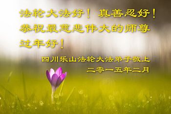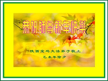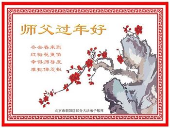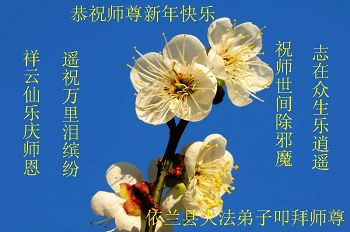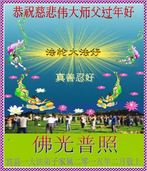 过年问候 在乙未年来临之际,我们大法弟子家属向李洪志师父问好!恭祝李洪志师父过年快乐!万事如意。作为大法弟子家属我们一定牢记“法轮大法好,真善忍好。”