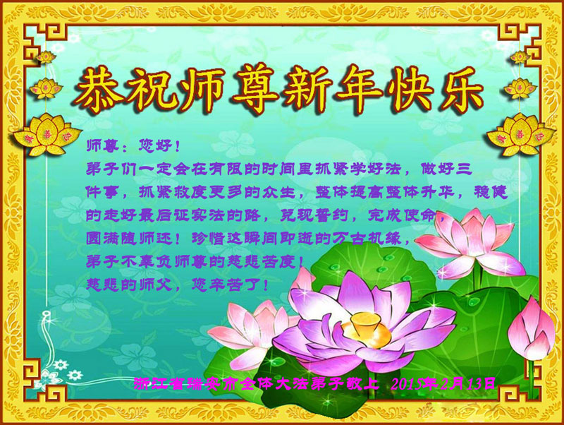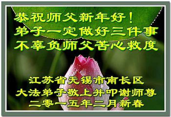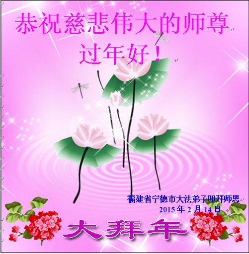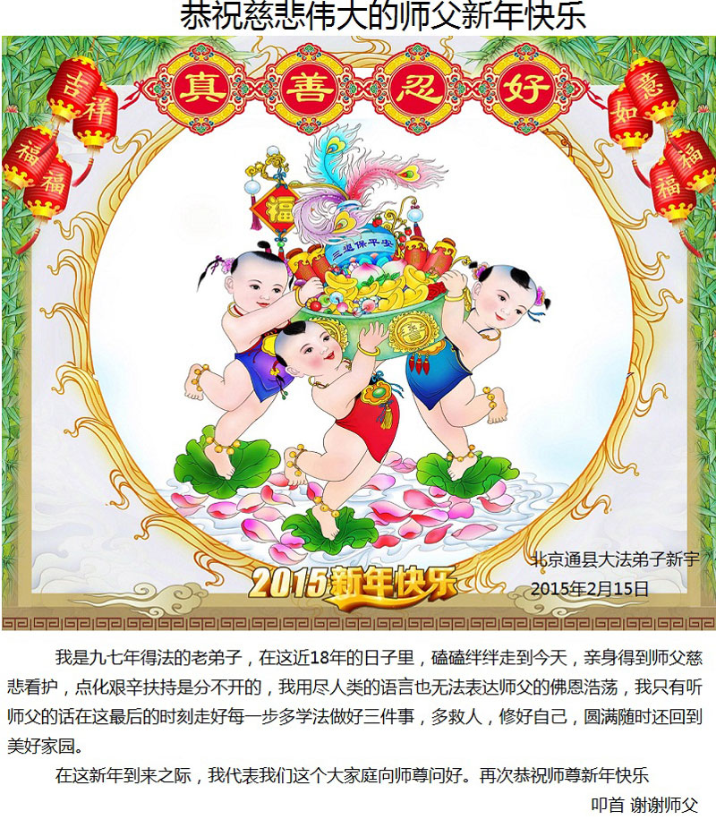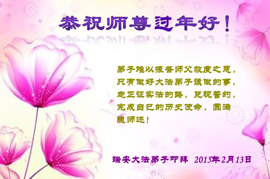 在2015年新年之际,我代表全家向尊敬的李老师拜年,祝李老师新年快乐!愿法轮大法洪扬宇宙,早日法正人间。