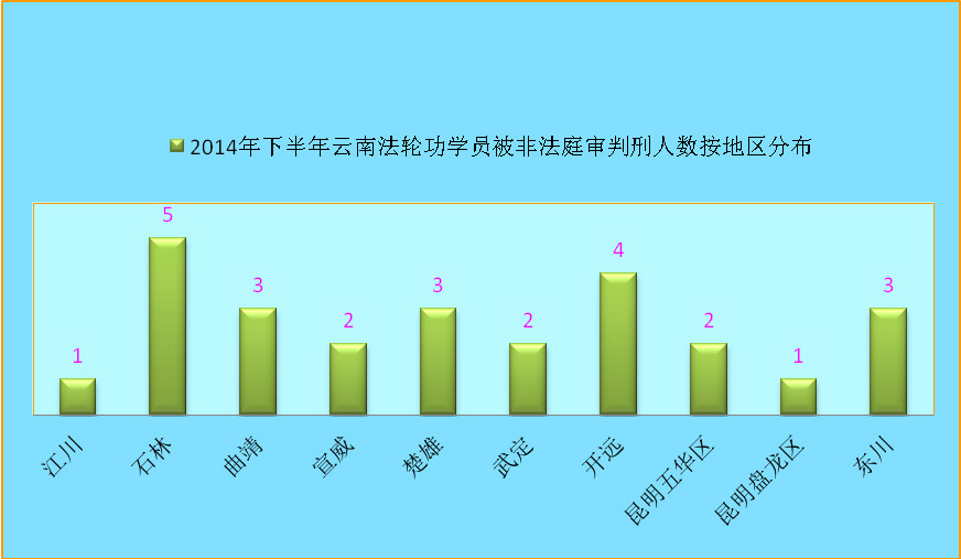 ![]() 图2. 二零一四年下半年云南法轮功学员被非法庭审判刑人数按地区分布 |