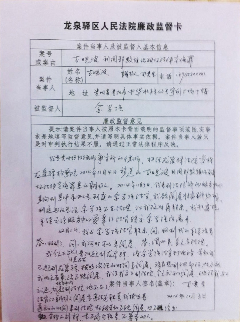 ![]() “龙泉法院廉政监督卡”照片 | ![]() “控告信”照片 |