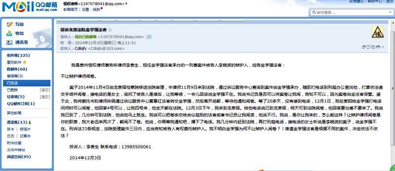 | 我是贵州恒权律师事务所的律师,担任龙泉驿法院受理龙泉驿检察院2014年11月4日移送的李晓波利用X教组织破坏法律实施罪 案的辩护人。2014年11月9日,我来到法院诉讼服务中心,查询到案件承办人是刑庭的金学强法官,我欲阅卷准备辩护工作,刑庭书记员说金学强不在法院, 让我改时再联系。我将委托手续交给服务中心夏章红法官转交金学强后离开。 12月1日,我与金学强法官联系,问:收到我的手续没有?答:收到了。问:我何时可以来阅卷?答:周四来,全天在法院。 我今天下午4点左右从贵阳赶到龙泉驿,给金学强法官打电话,告知我已赶到龙泉驿,按照你说的时间来阅卷。没有想到他却说,对不起,我明 天有事,你不能阅卷。我说我马上到法院,今天就可以阅卷。他说我马上就走,我十分钟内赶到法院,他不在了。 法官让辩护人阅卷是其法定职责。我按照其通知的时间来到法院,却被告知不能阅卷,也不给出合理的解释,是不履行职责,不尊重他人。 案件当事人签名(盖章):李贵生 2014年12月3日 | ||||