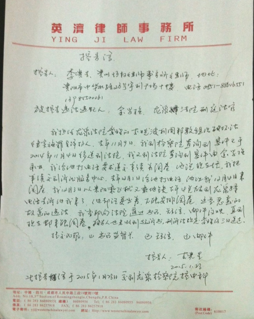 此控告信于2015年1月23日交到龙泉检察院控申科