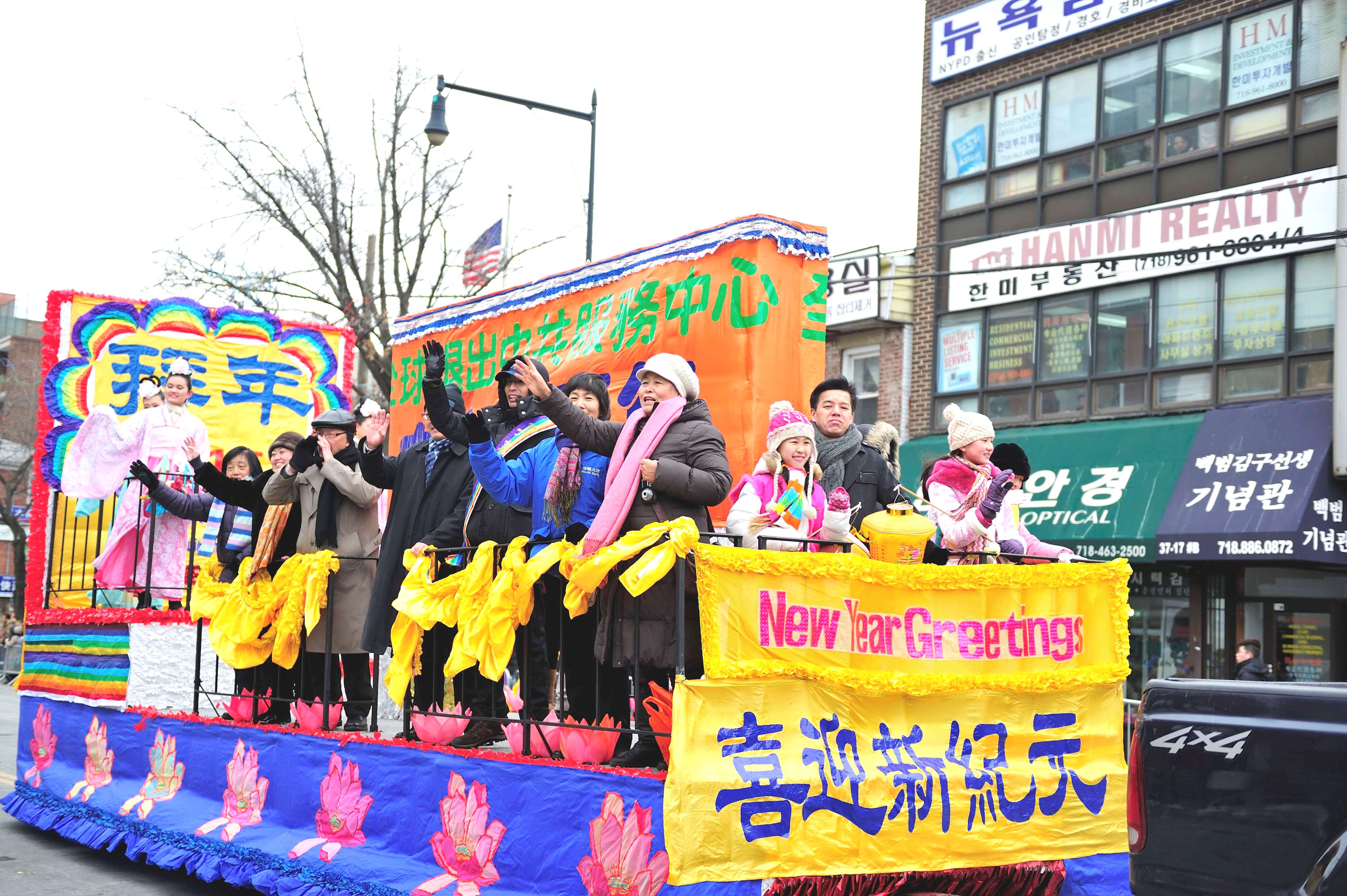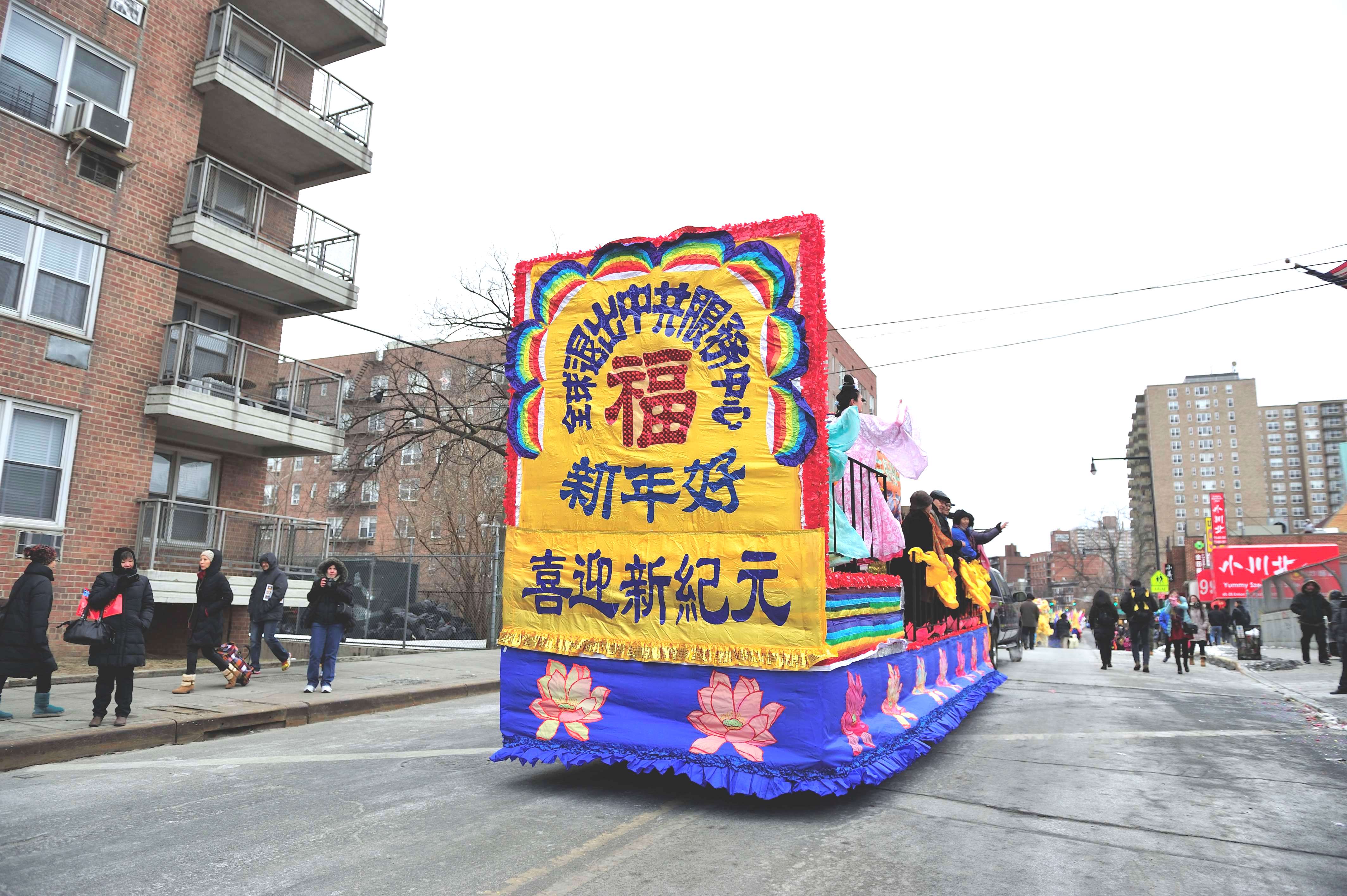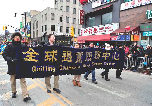 “全球.退:党!服务中心”的队伍以金狮开道,锣鼓喧天,并有美丽的花车,庆祝新天地。总部设在纽约法拉盛的“全球.退:党!服务中心”负责人易蓉说,“全球.退:党!服务中心”的义工是法拉盛社区活跃的一员,退!党!服务中心多年参加法拉盛的新年大游行。