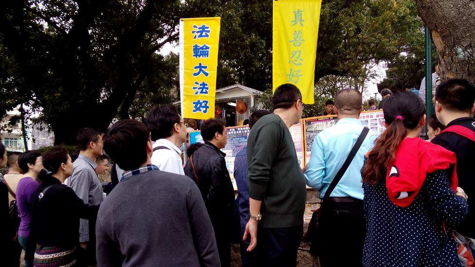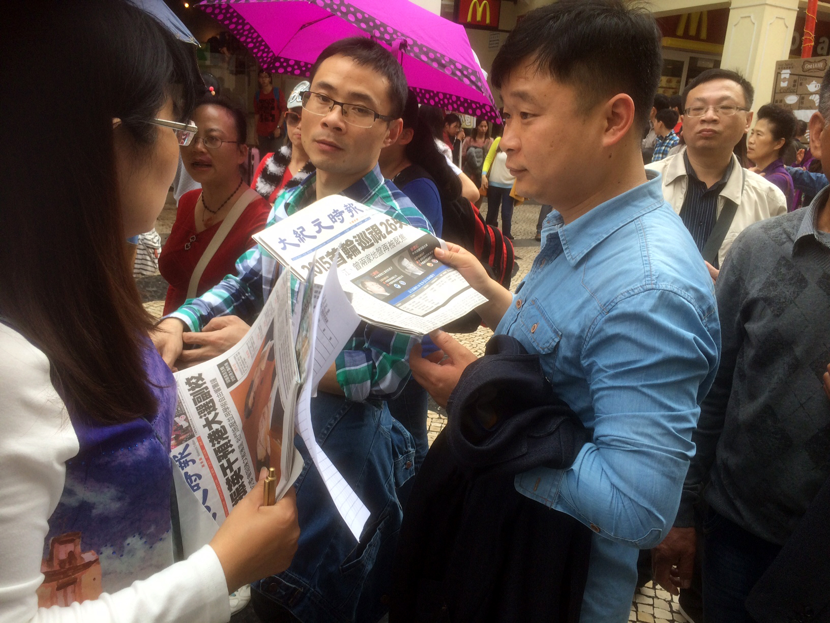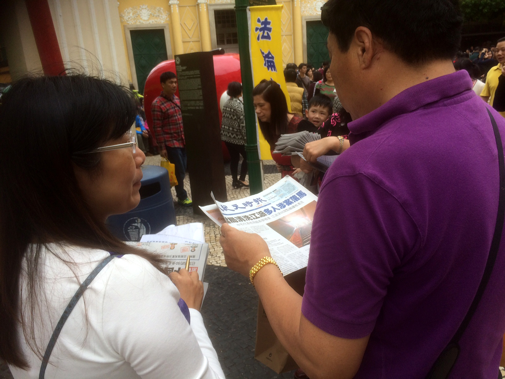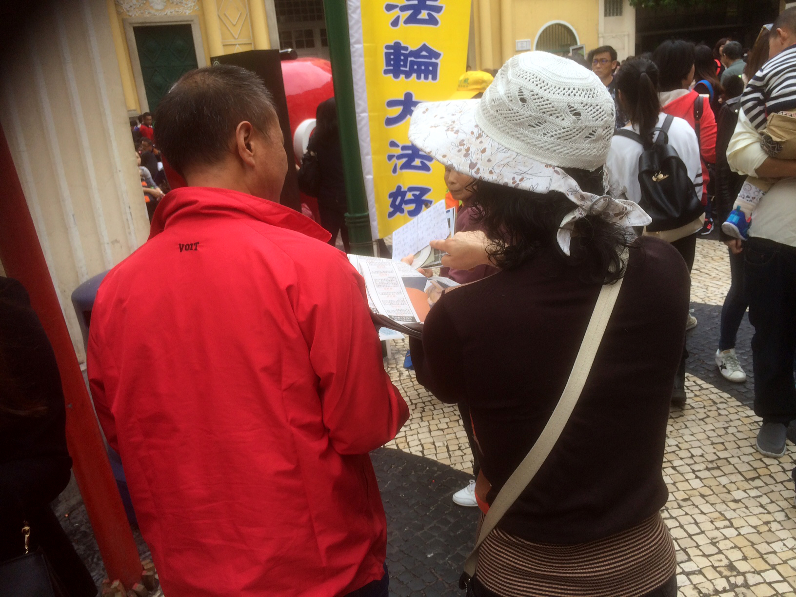 还有很多大陆游客像发现新大陆一般,欣喜地告诉身边的同伴:“澳门也有法轮功!”有的举起相机和手机拍摄真相图片和大旗子,有的更拉着旗子一起拍照留念。也有很多游客取阅报纸及真相光碟,包括一些明白真相,以前做了三:退.的民众,再来取资料带回给大陆的亲友。
