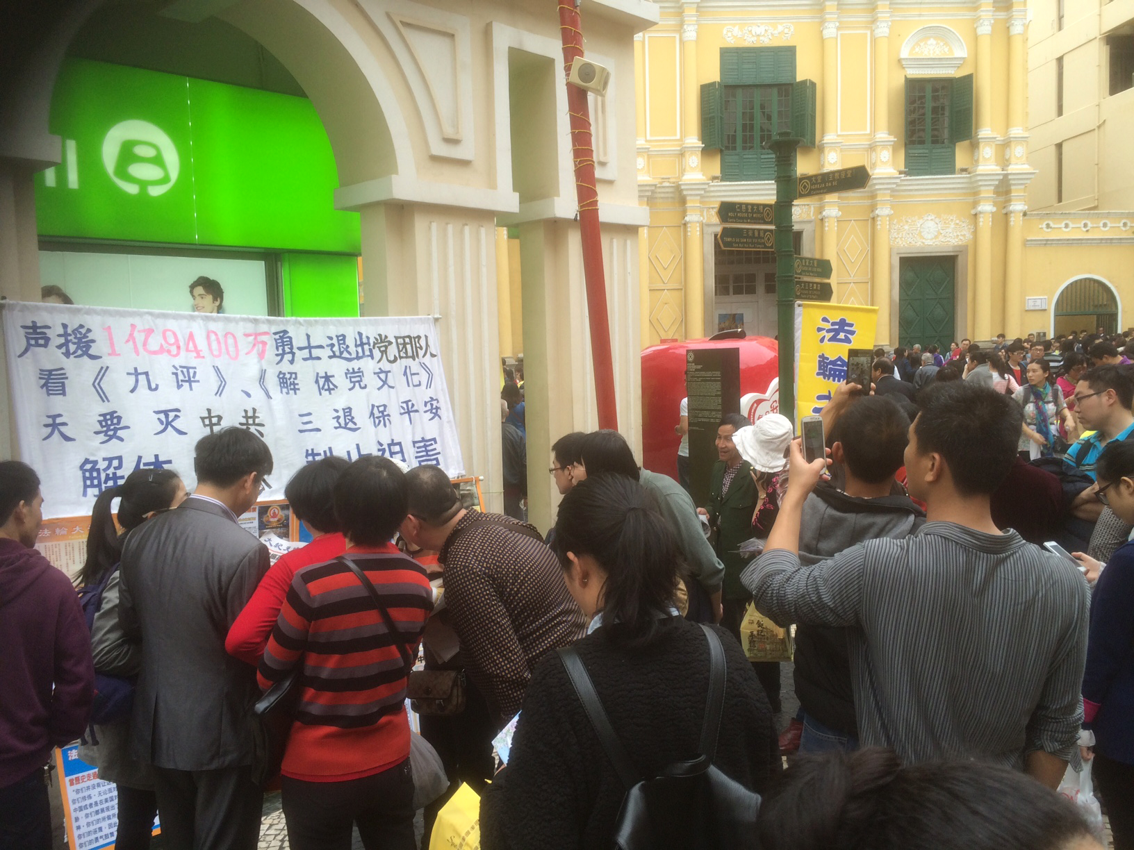 澳门的法轮功学员利用过年的假期,每天在大三巴和玫瑰堂前的两个真相点讲真相,劝三:退.。仅大年初一至初四,劝退了近两千人,最多一天,一天劝退了六百多人退出共产党、共青团或少先队。