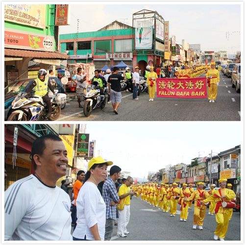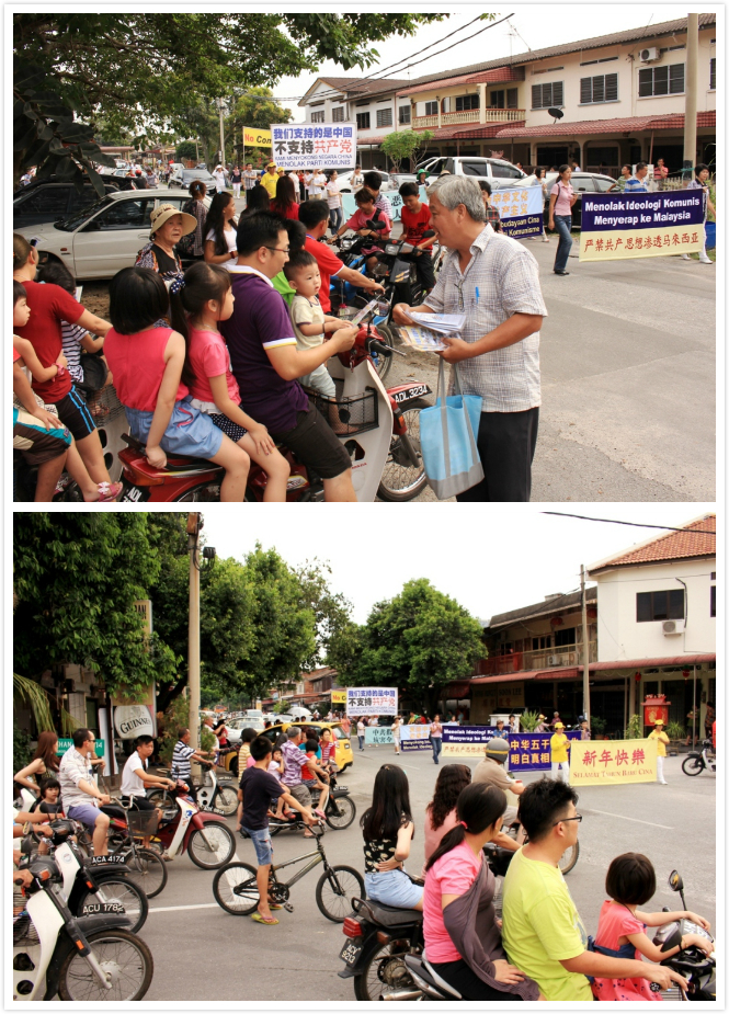大年初三,法轮功学员来到了霹雳州(Perak)华人聚集的拱桥新村(Kanthan Baru)举行新年游行。在游行开始前,已经吸引了许多民众驻足围观。今年四十三岁,在新加坡从事家具企业的李永森在游行的起点表示,这么多年从未看过有这样的游行,他感觉蛮好、比较热闹、比较开心。