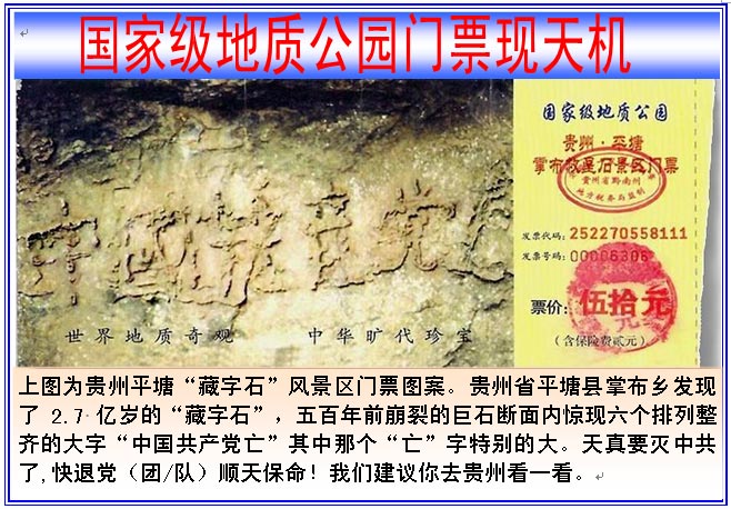 2002年6月,在贵州省平塘县掌布乡发现了2.7亿年的“藏字石”,五百年前崩裂的巨石断面上惊现六个排列整齐的大字:“中国共产党亡”。中国的各路地质专家经实地考察后一致认为,这“藏字石”上未发现任何人工的痕迹。海内外一百多家报纸、电视、网站转发了这条消息。“藏字石”的图片还被赫然印在贵州“藏字石”风景区的门票上(见下图)。
