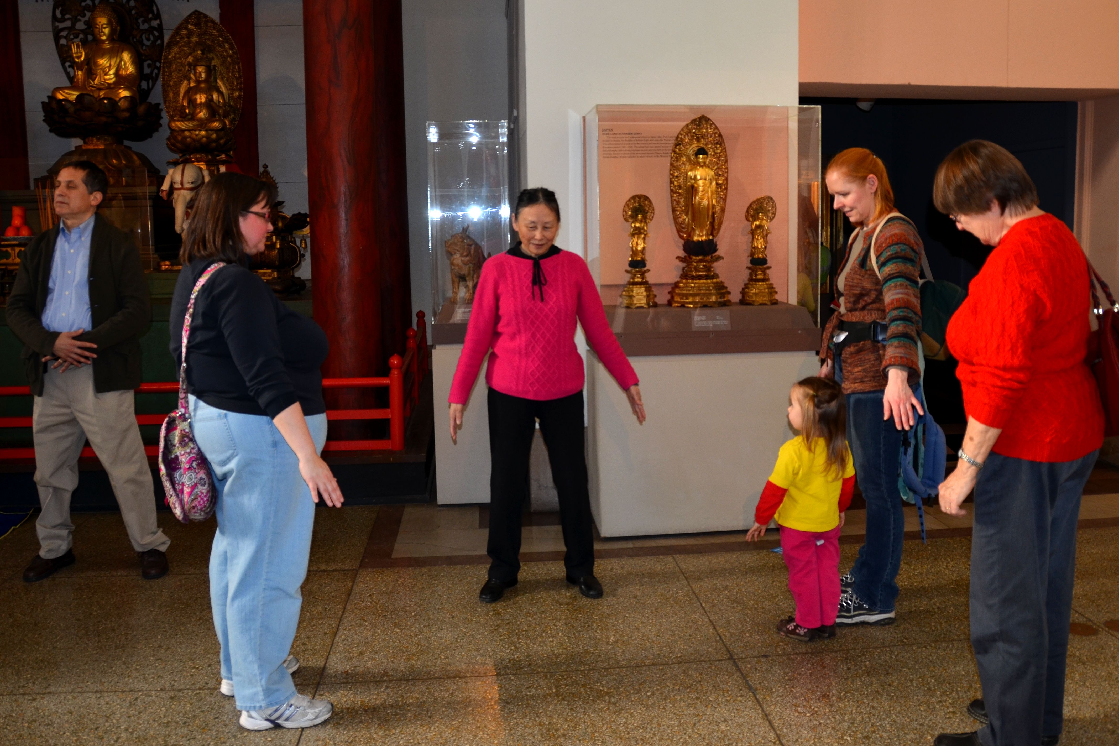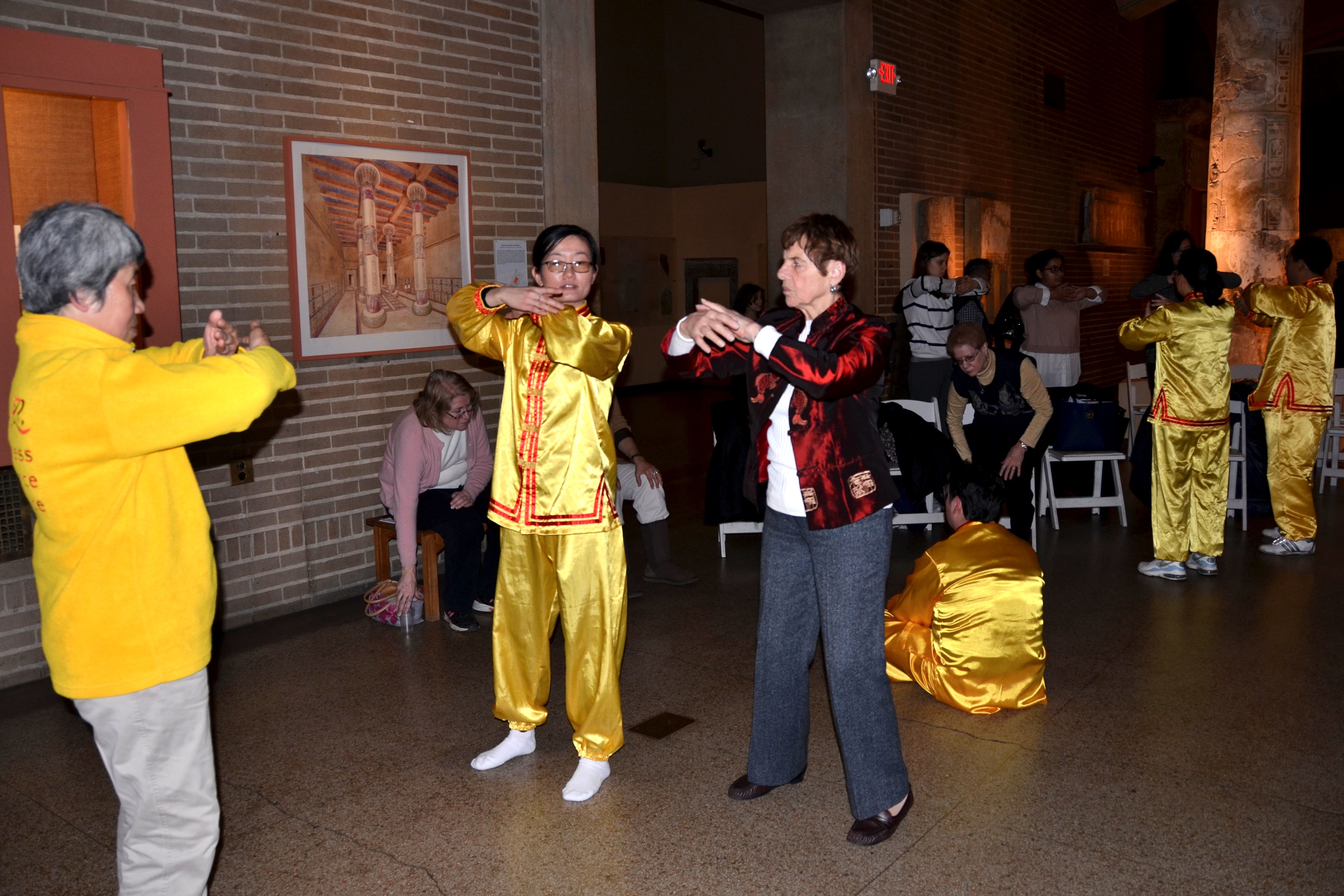 ![]() 图4: 宾大博物馆中国新年庆祝活动的组织者专门给法轮功学员安排了30分钟做法轮功功法演示。演示结束后,许多人兴趣盎然地学炼。 |