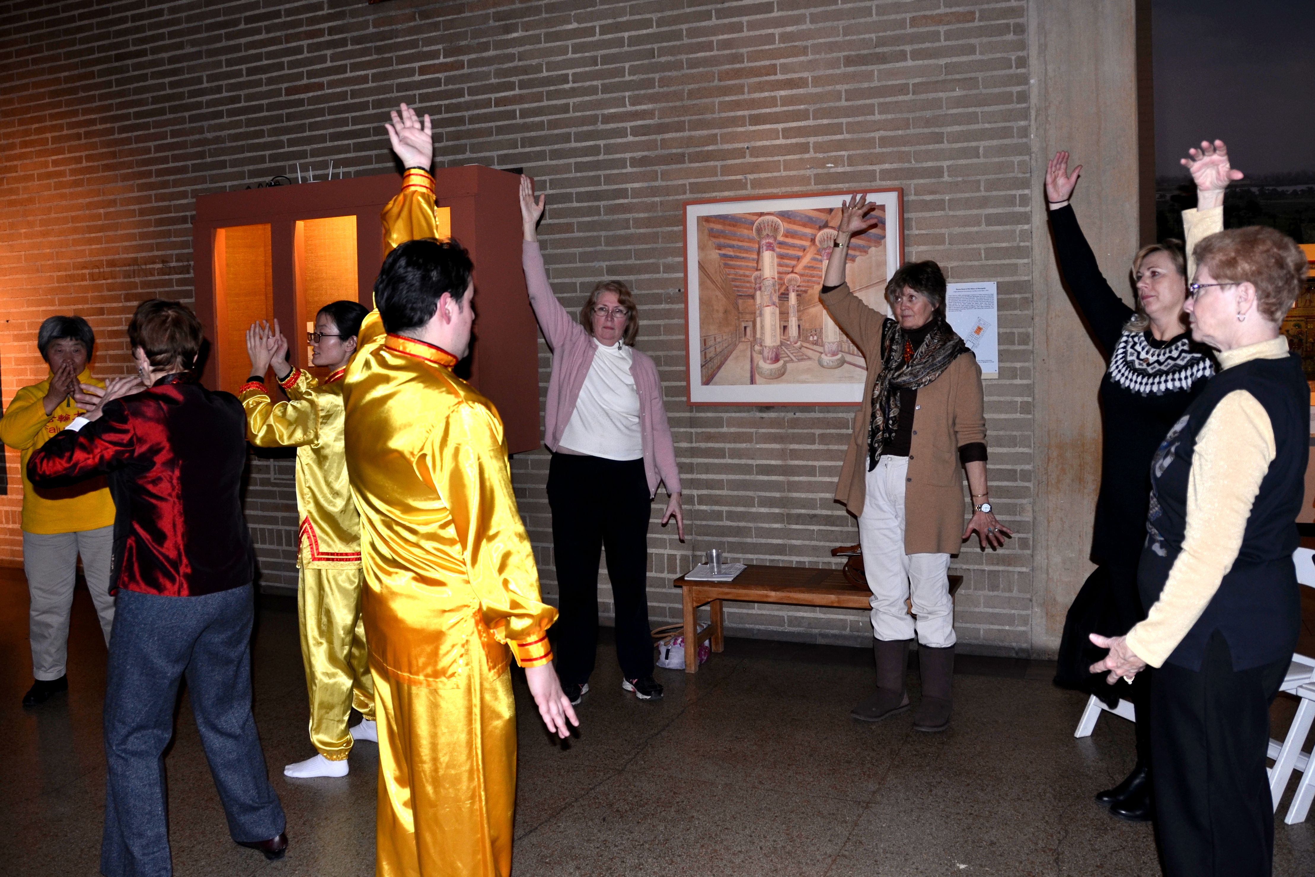![]() 图3: 宾大博物馆中国新年庆祝活动的组织者专门给法轮功学员安排了30分钟做法轮功功法演示。演示结束后,许多人兴趣盎然地学炼。 |