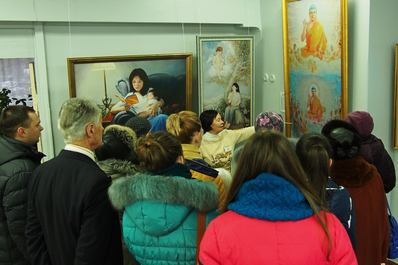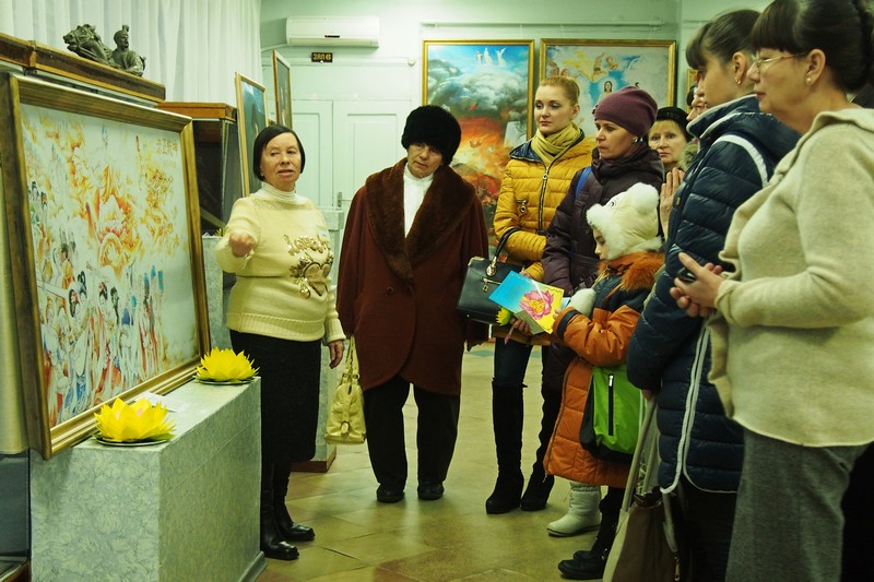 “在自己的人生历程中,美展艺术家向世人介绍法轮大法(法轮功)——一种古老的修炼精神道德和健康身体的功法。修炼法轮大法帮助他们开阔了对周围世界的认知,找到生命和艺术的最高意义。这些艺术家基于统一的信念:以艺术为媒介,遵从最高理念——真善忍,并使生命逐渐得到同化充实。”