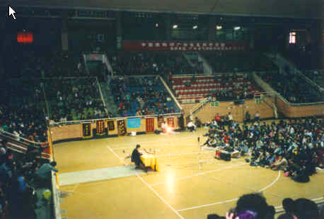 开班第一天,连体育馆的球场地板都坐满了,已超过五千人。没票的近百名学员在场外站着听,从话筒牵了根线到场外来,连着录音机,播放师父讲法。后来负责的学员与体育馆协商,体育馆决定把武术馆借给我们,现场直播师父的讲法。为使学员们都能听清楚师尊讲法,一个老学员抱着录音机站在凳子上,直至师尊讲法结束,其间,不时需移动一下,接收好信号。