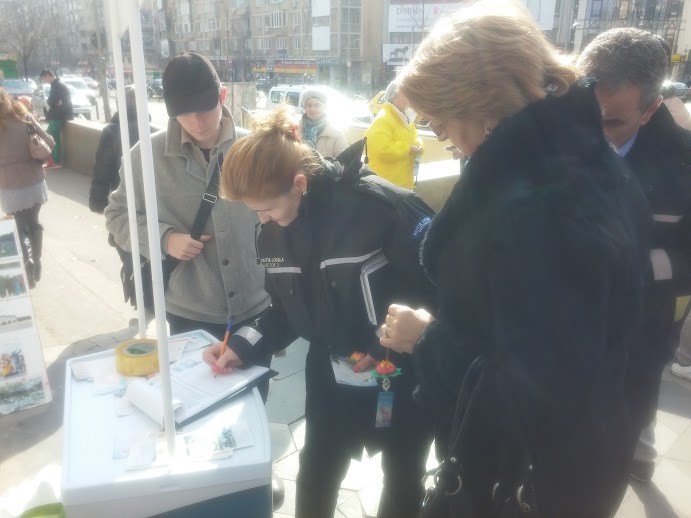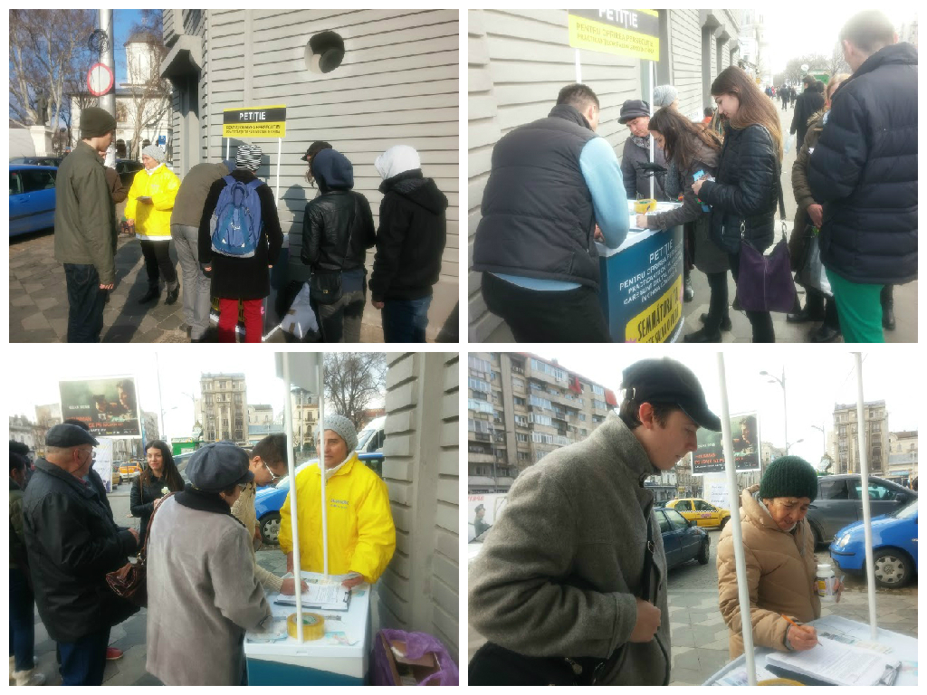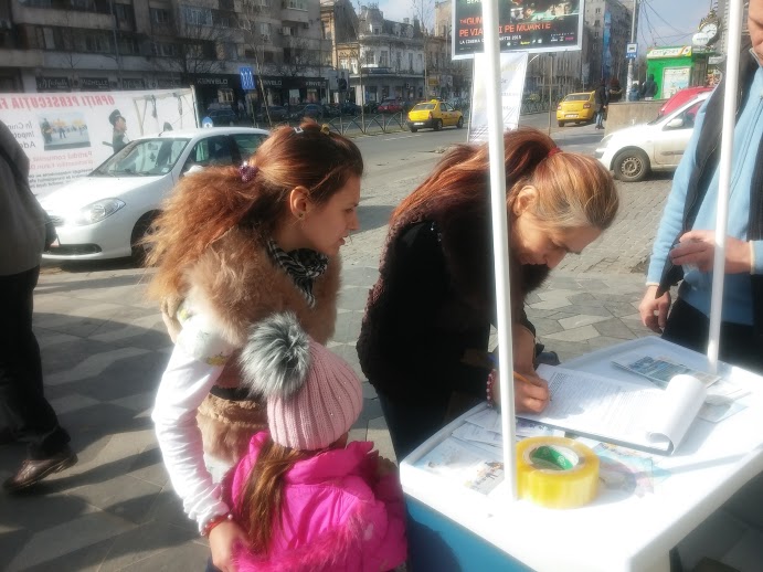 二零一五年三月八日,罗马尼亚法轮功学员在布加勒斯特市(Bucharest)的圣格奥尔基(Sf. Gheorghe)中心举办了法轮功真相信息日,学员们向过往的行人散发真相传单,讲述从一九九九年以来,中国大陆发生的中共对法轮功的残酷非法迫害。