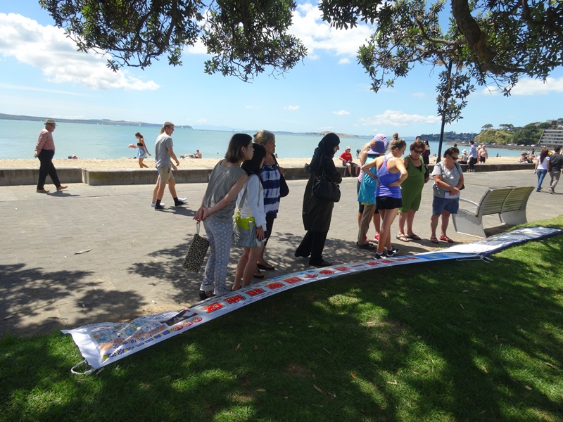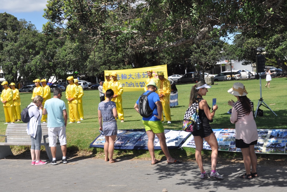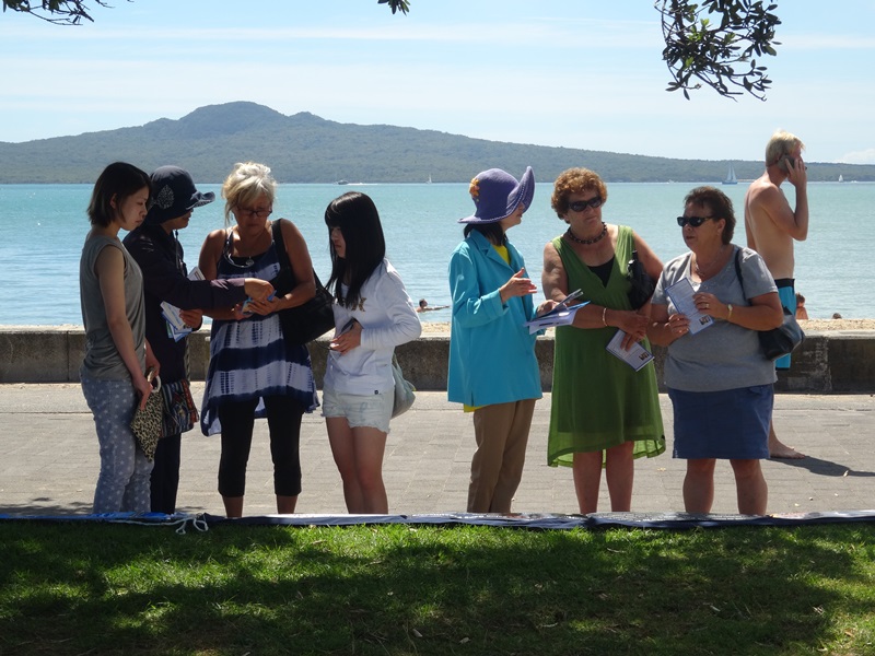 从英国来新西兰探亲旅游的中年西人女士玛丽(Mary)和侄女安妮(Annie)在法轮功展板面前驻足观看。她们向学员了解了法轮功的信息。她们很高兴能知道法轮功书籍和教功录像可以从网上免费下载,学炼后能让人身心受益;她们也了解到中共对法轮功学员长达十五年的残酷迫害的真相。玛丽表示回到英国后会上网了解更多的法轮功信息,很有兴趣学功。安妮是奥克兰人,她说这是第一次拿到关于法轮功的信息,也很希望继续深入了解。