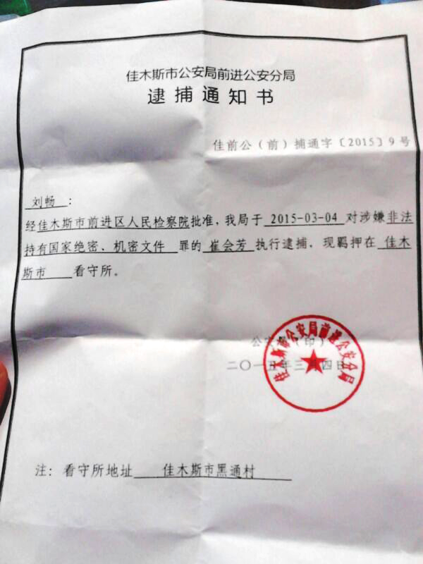 三月五日,崔会芳的家属被告知崔会芳已被批捕,被控“非法持有国家绝密机密文件”,并叫其去签取批捕通知单,此前佳木斯市前进区检察院批捕科孙宏国和另外两个人,曾去佳木斯市看守所告知崔会芳本人已被批捕。