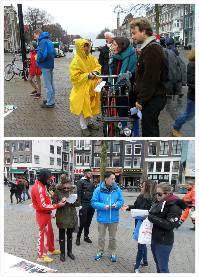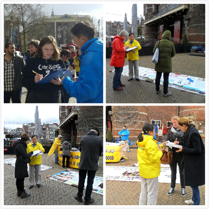 很多行人了解了展板上关于法轮大法弘传世界以及中共恶党迫害法轮功的真相之后,对法轮功学员和平理智的反迫害的行动予以支持。有很多荷兰市民和其它国家的游客,在了解到中共活摘人体器官真相后,在制止活摘器官的征签表上签名,表达对法轮功学员的支持。