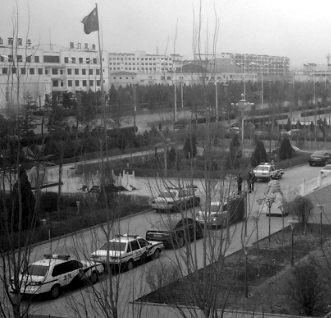 十九日早上八点三十左右,到法院的大十字路口都戒严了,法院门口已经布满了层层的警察和警车,如临大敌;法院的大门外,一帮警察围了过去,要进入旁听席的人出示身份证,并进行安检。法警们又是用镜子照,又是翻衣服,入门时一男警用手又对每个人摸一遍。