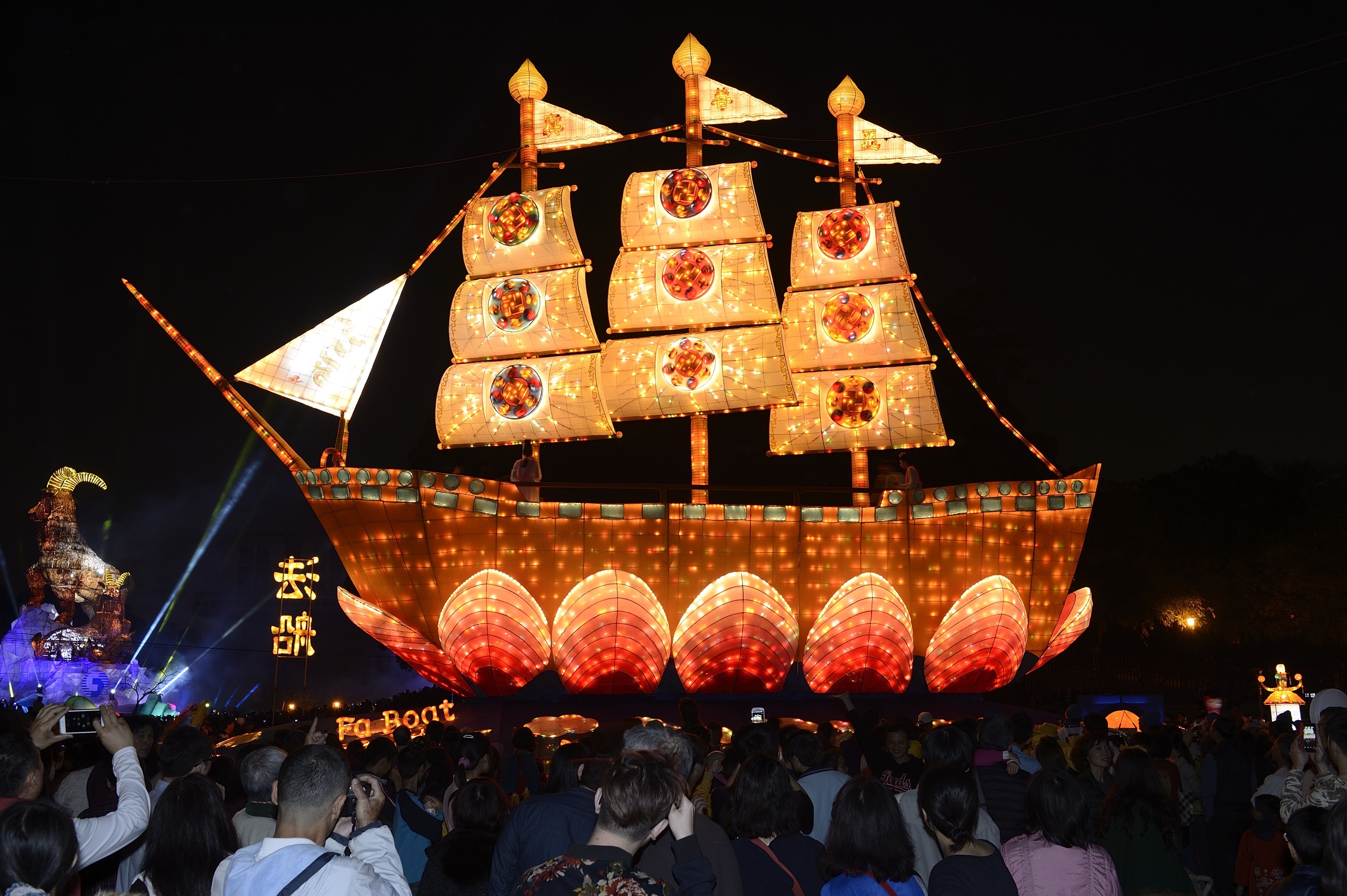 ![]() 金碧辉煌的法船在台湾灯会台中灯区登场,民众赞叹,纷纷拍照留念。 |