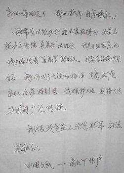 四川一位76岁的老人在贺卡中说:“我天天都诚心敬念‘法轮大法好’,护身符用布缝好每天都戴在身上,我的身体越来越好,这么大年纪还可以帮儿子带孩子,还可以干农活。我身体好就是我儿女们的福气。新年来临之际,我带领儿女叩拜李大师,感谢李大师对我们的护佑!”