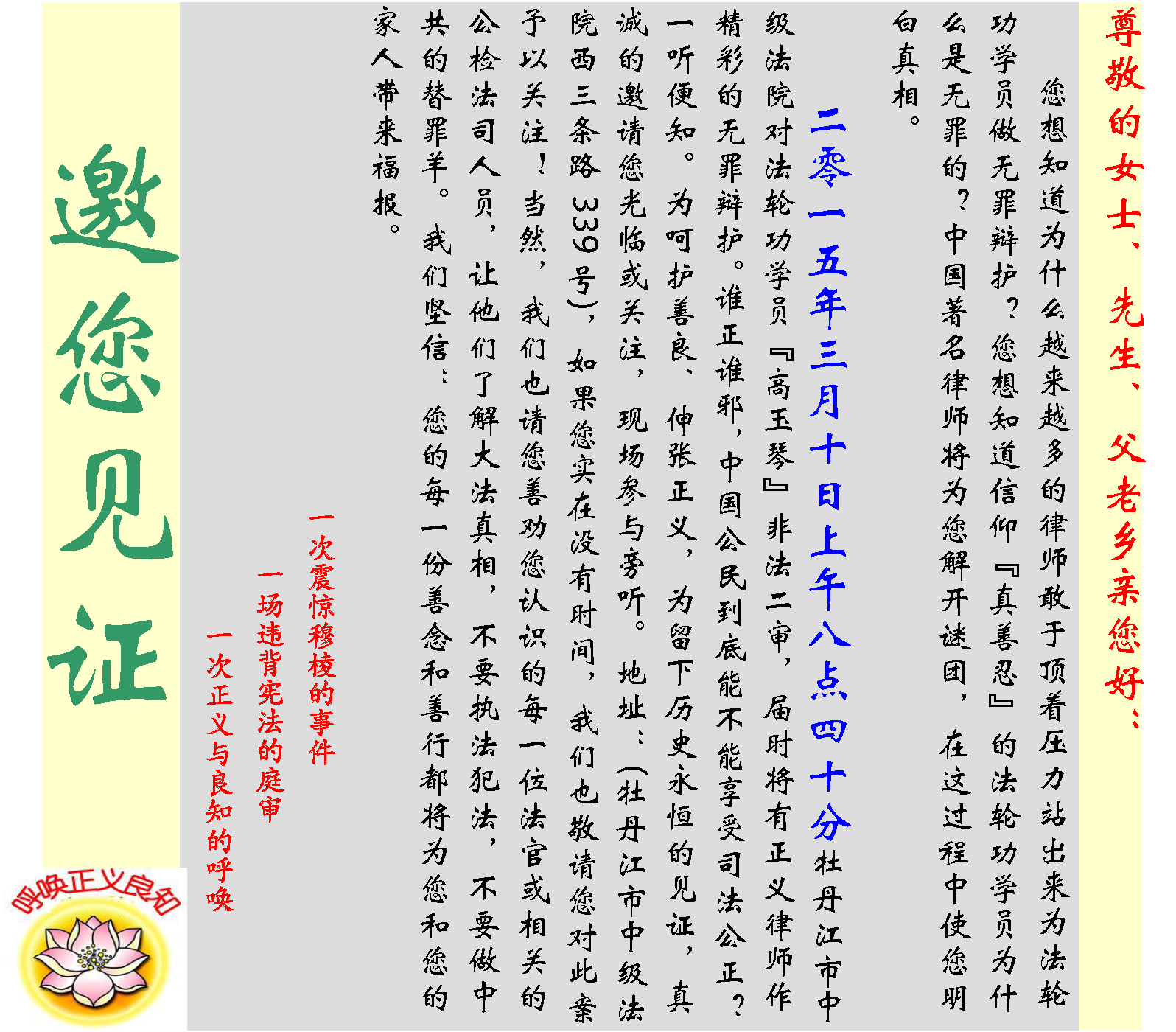 【明慧网二零一五年三月八日】下面这张请柬是黑龙江省牡丹江市法轮功学员制作并对当地居民广泛散发的。请柬告诉大家的是,律师要为牡丹江穆棱市河西乡农妇法轮功学员高玉琴作无罪辩护,时间是二零一五年三月十日上午八点四十分,地点在牡丹江市中级法院。