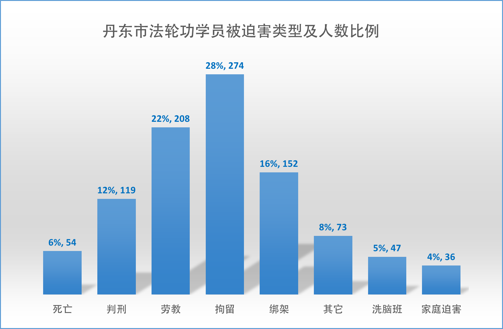 ![]() 丹东市法轮功学员被迫害人数按迫害类型分布以及人数比例 |