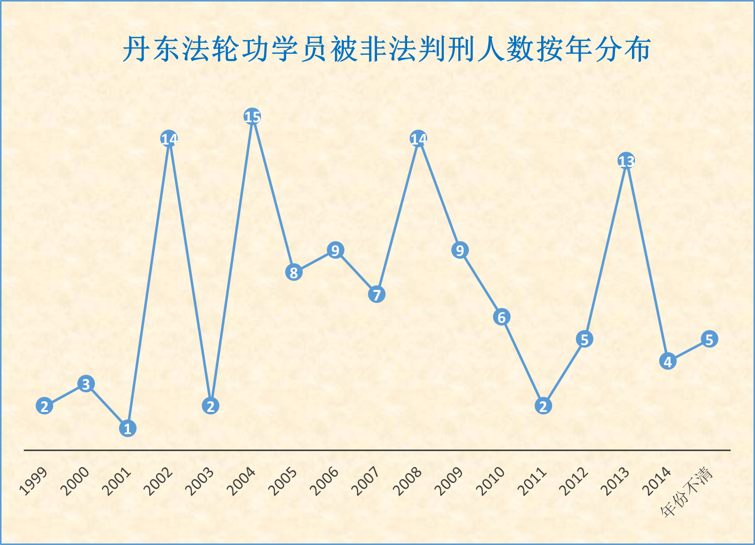 据统计数字看,丹东市15年间非法判刑119人次,累计刑期556.25年。人均刑期4.75年,最高非法判刑9年,二次非法判刑的6人;劳教又非法判刑的12人,非法劳教一次,非法判刑二次的1人,非法劳教二次非法判刑一次的5人;累计超过10年刑期的8人。统计显示,非法判刑一年的有15人次。