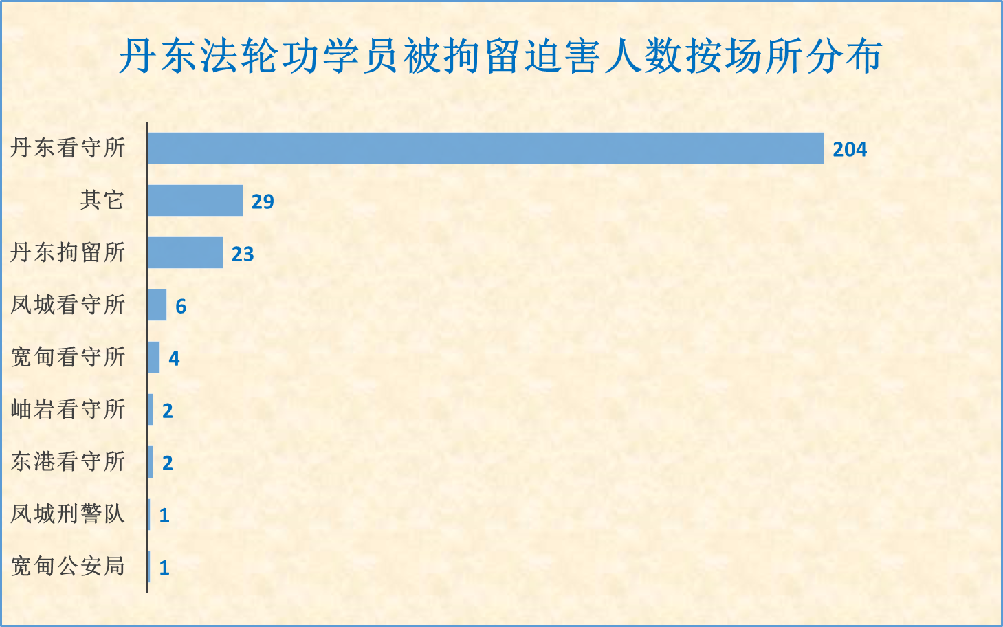从迫害的场所看以丹东看守所为最多,204人次占75%,几乎都在丹东看守所羁押。当时据被拘留的学员讲,不到二十平米的小屋关押30多人,在地铺上人就像码货一样一颠一倒的躺,一个人抱着另一个人的脚,如果上厕所回来就没有地方躺了。
