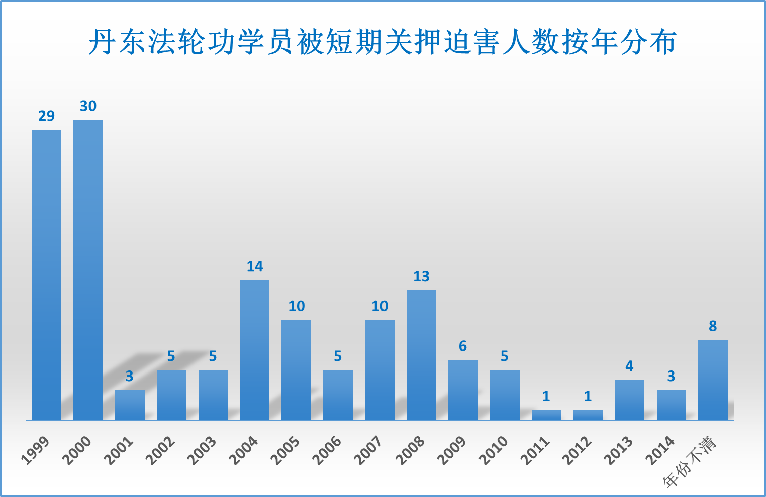 ![]() 丹东法轮功学员被短期关押迫害人数按年分布 |
