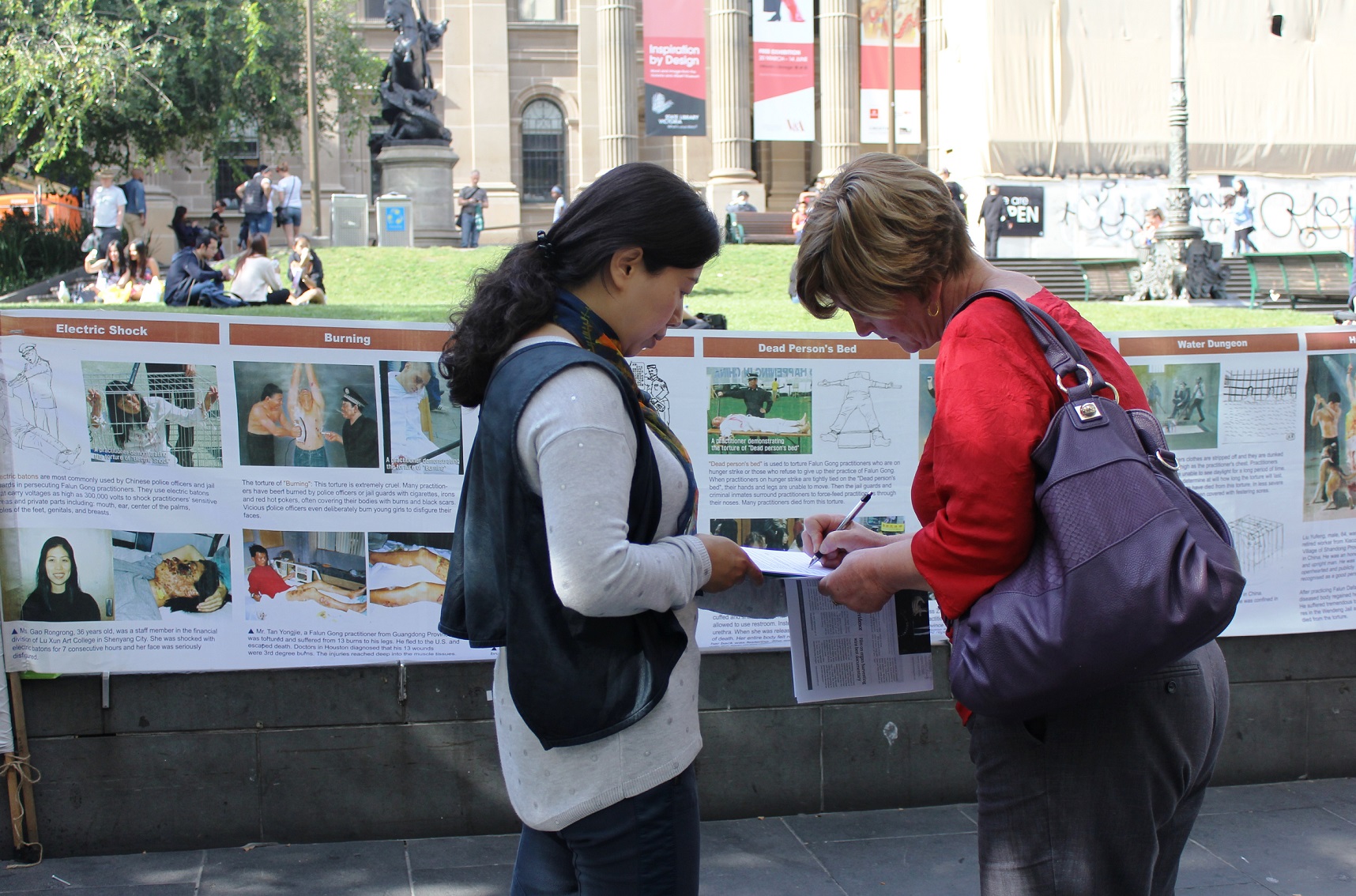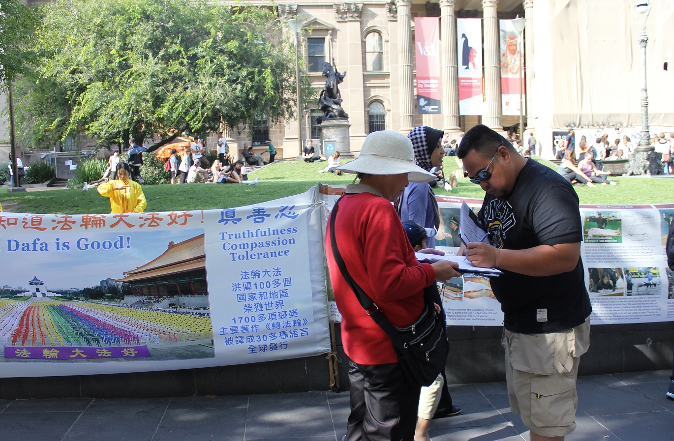 就在刚刚过去的这个周末,法轮功学员在墨尔本省立图书馆前,明显感受到民众对此更多的关心和对制止反人类暴行的支持,他们在呼吁政府立法制止中共反人类罪行的公开信上签名之后,纷纷表示将在社交媒体上、向自己的亲友告知他们了解到的这一切。