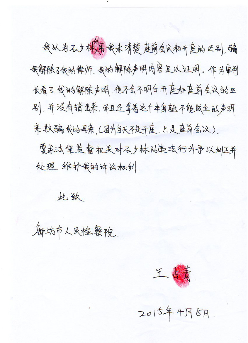 然后,石少林继续欺骗王占青:“根据法律规定,律师不参加庭前会议依法剥夺其辩护资格。法院可以提供法律援助,给你提供免费律师。”法警在旁怂恿说“用我们指定的律师,又不掏钱又快。”被王占青断然拒绝。石少林说:“你写一个自愿解除对陈智勇律师委托的书面声明,然后给你十五天时间,你可以再请律师。”接着,石少林站在一旁口述,王占青写了“因开庭律师未到,解除委托”的声明。三月二十四日,石少林又欺骗王占青母亲王连双说:“王占青已经自愿解除对陈智勇律师的委托。如果你们还想请律师,明天来法院办手续。”