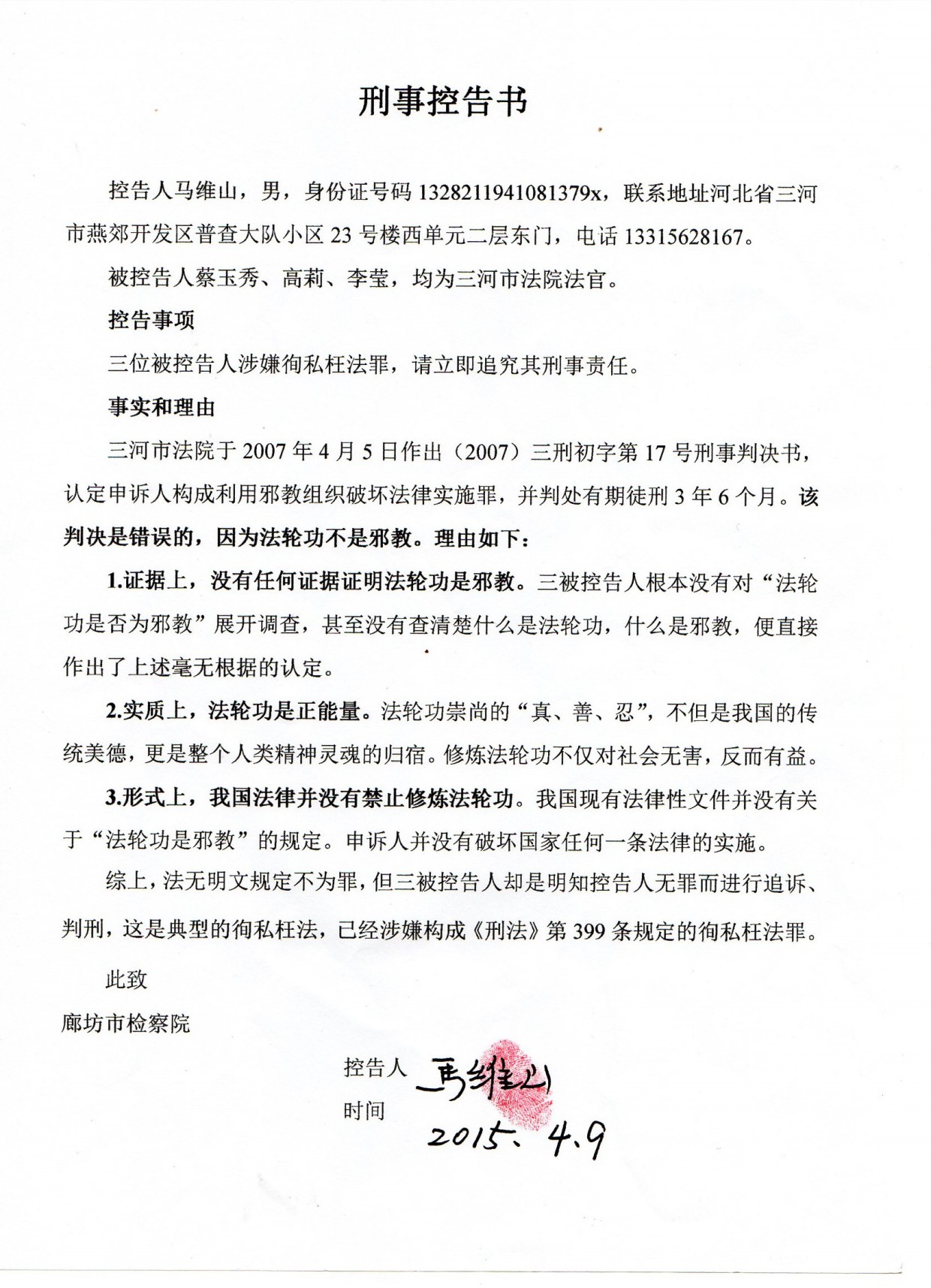 二零零七年四月五日,三河市法官蔡玉秀等人枉法诬判马维山“利用邪教组织破坏法律实施罪”,判处有期徒刑三年零六个月。当事人马维山对蔡玉秀、李莹、高莉提出刑事控告,请求依法追究其刑事责任,理由如下: