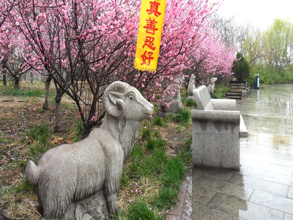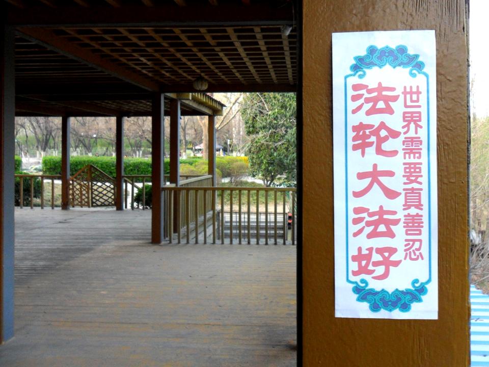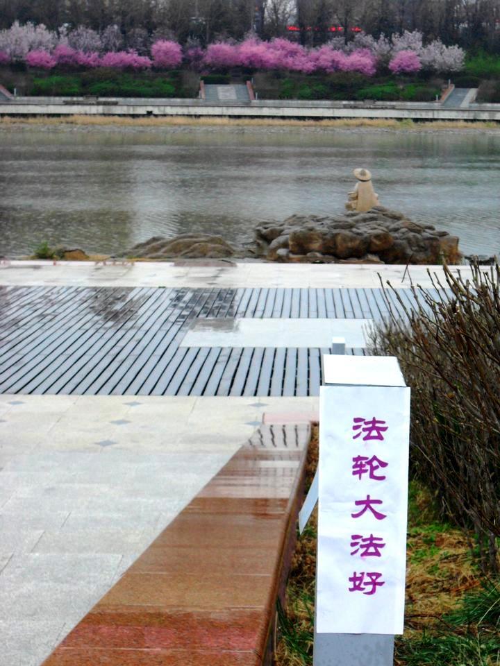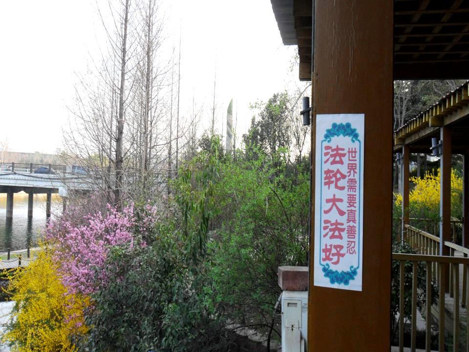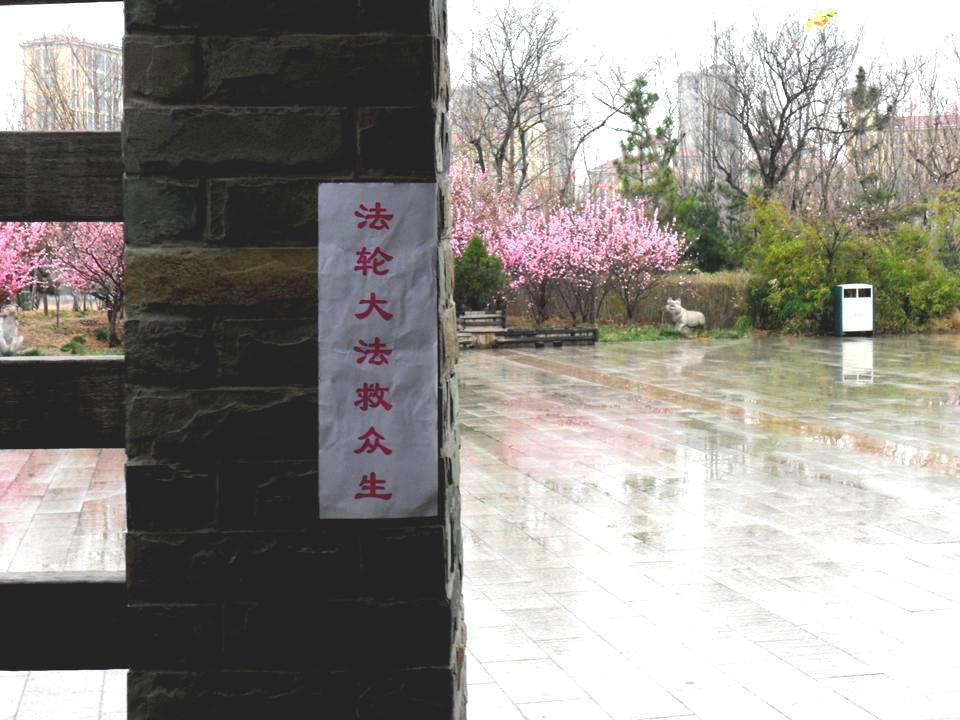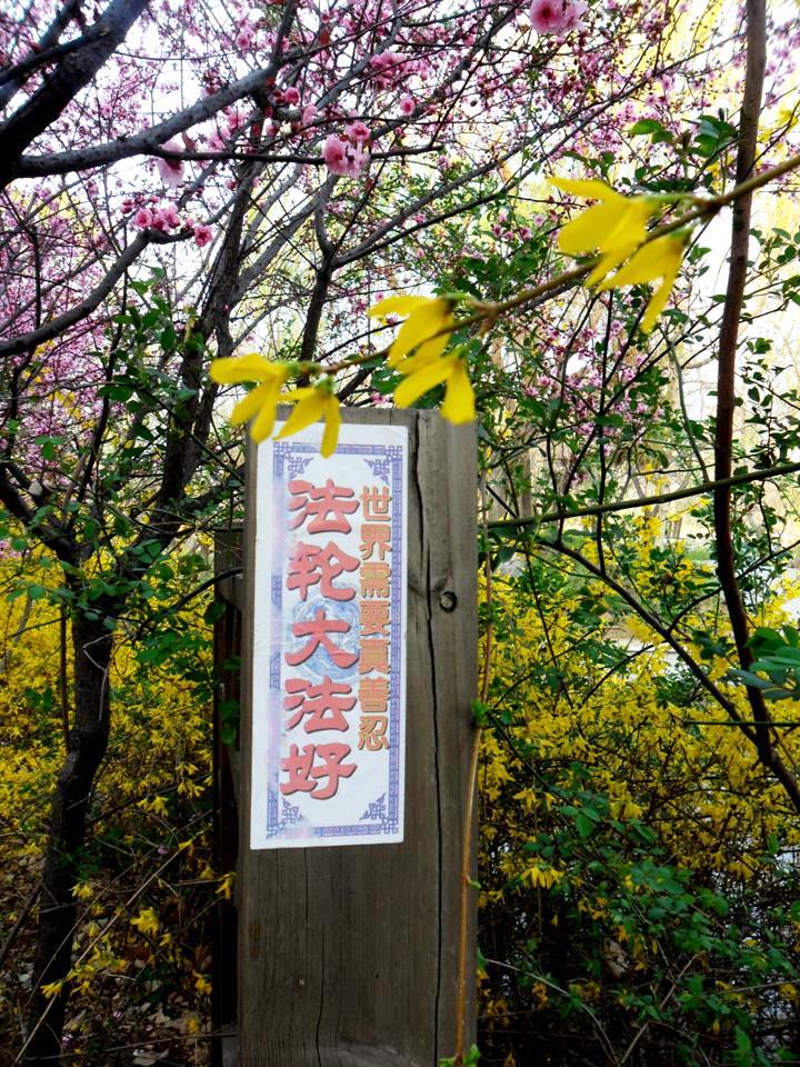 今年清明节,与往年不同的是,许多有缘人纷纷来到张贴“法轮大法好 真善忍好”的地方摄影留念。