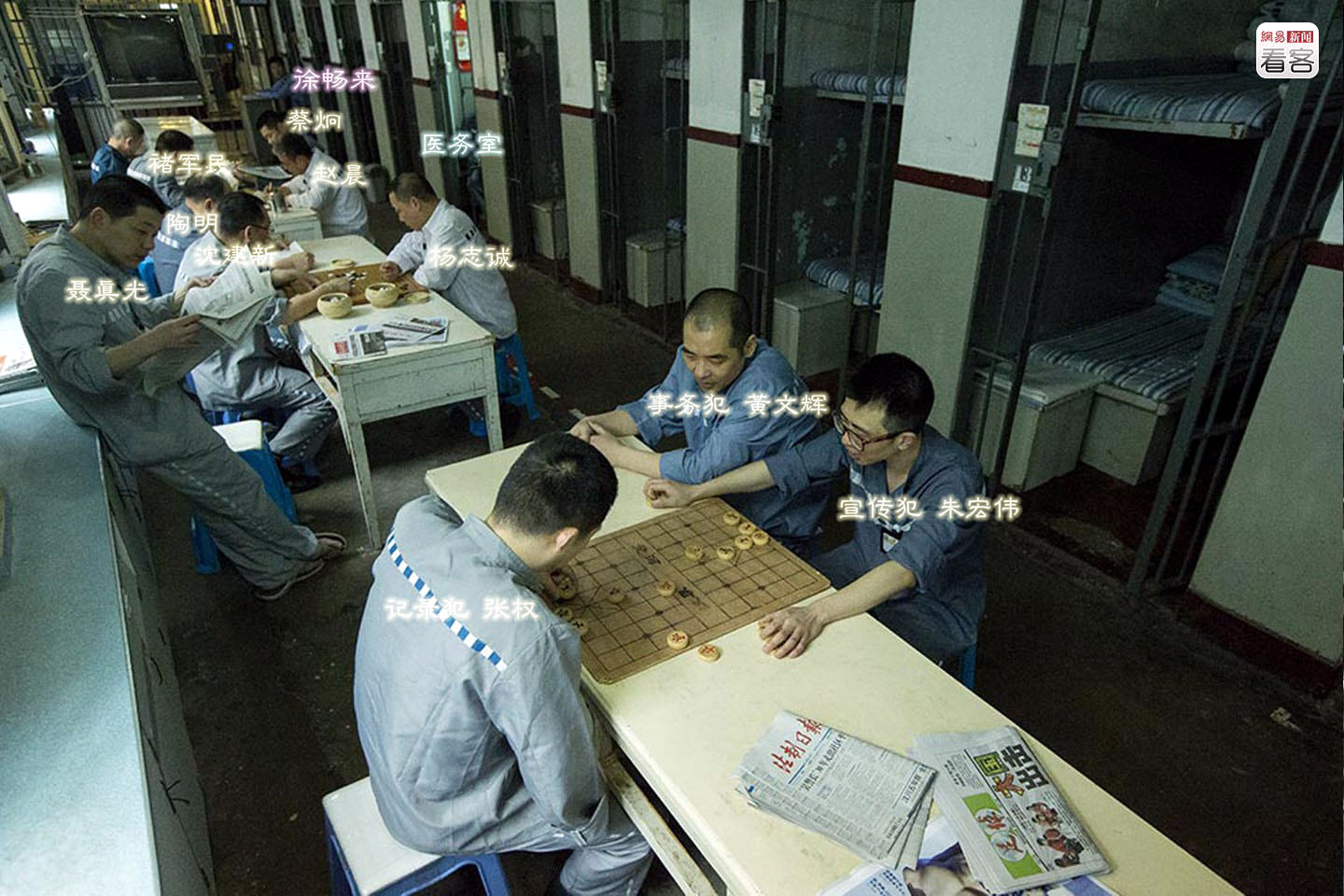 近处是记录犯张权(自称是“610”通讯员,上海胶州路大火案犯,被判十三年半),与他下棋的是宣传犯朱宏伟(绰号小嘎亮,杀人犯),旁边头剃掉的是事务犯黄文辉(贩毒犯,被判十五年)。