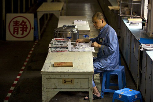 手里拿着报纸的是恶犯聂真光(绰号小日本),他是上海周正毅案的从犯,帮助周正毅伪装手机,被判二年缓刑,二零零八年又因为贩毒被判九年,晚上故意用木棍捅醒法轮功学员。他在照片中的姿势,其实在因为要看管对面小间里的法轮功学员。