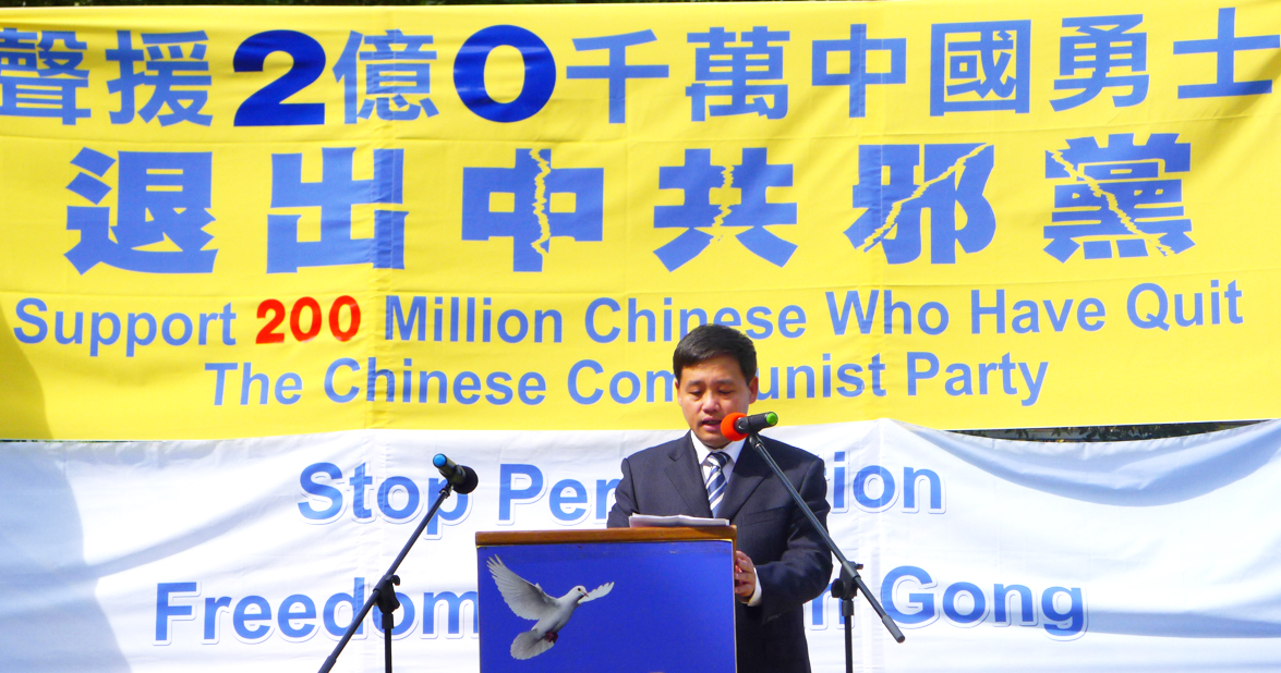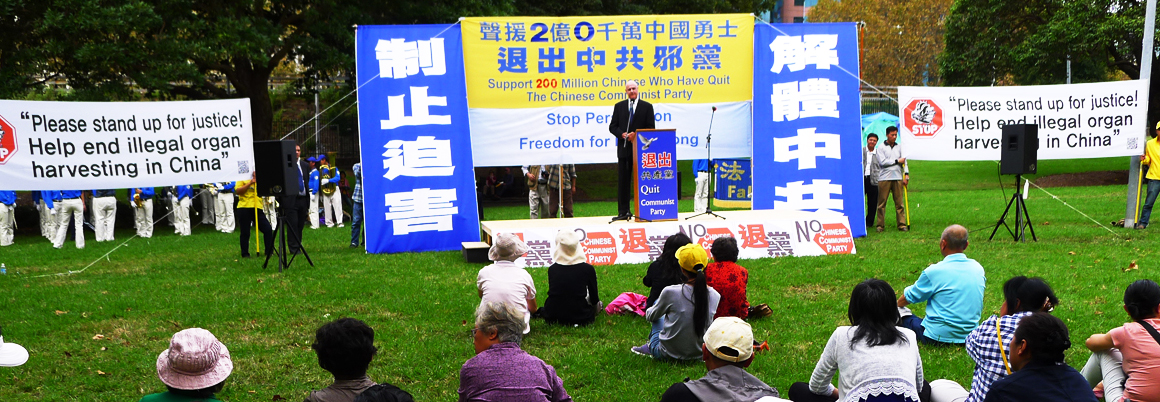 法轮大法学会澳洲发言人约翰•戴勒(John Deller)在集会上表示:“中国人从法轮大法中发现(寻找到)中国传统文化的精髓和道德基础。世界各地以及在中国的法轮功学员们用他们的言行正在帮助越来越多的中国民众退出中共党、团、队。‘三:退.’是帮助和引领中国人民进入到一个没有谎言、腐败和暴力体制的未来,一个使他们的良知和人性内涵能够充分表达和得到珍惜的未来!”