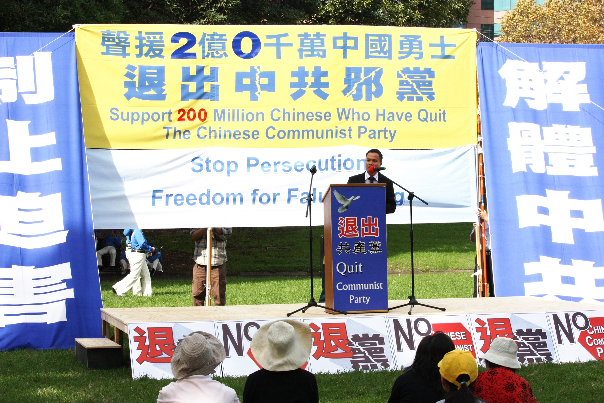 市议员安德鲁•威尔逊(Andrew Wilson,Parramatta City Council Councillor)先生到场支持声援。对两亿中国人民退出中共,表示非常赞赏,他表示:“退出中共并不象退出足球协会那么容易。在中国,如果你和你的家庭想在政治和经济上有所成就,你就必须加入中共党员。然而请看这两亿中国人民做了什么?在面临物质利益损失的情况下,他们和家庭成员选择了坚持道德良知(退出中共!)”
