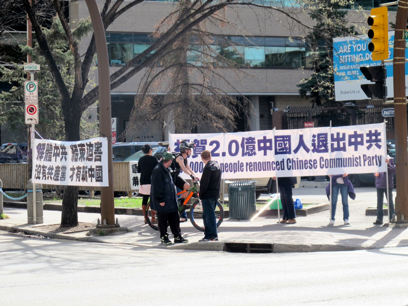![]() 卡尔加里大法学员在中领馆前拉横幅,庆祝两亿中国人“三:退.”。 |