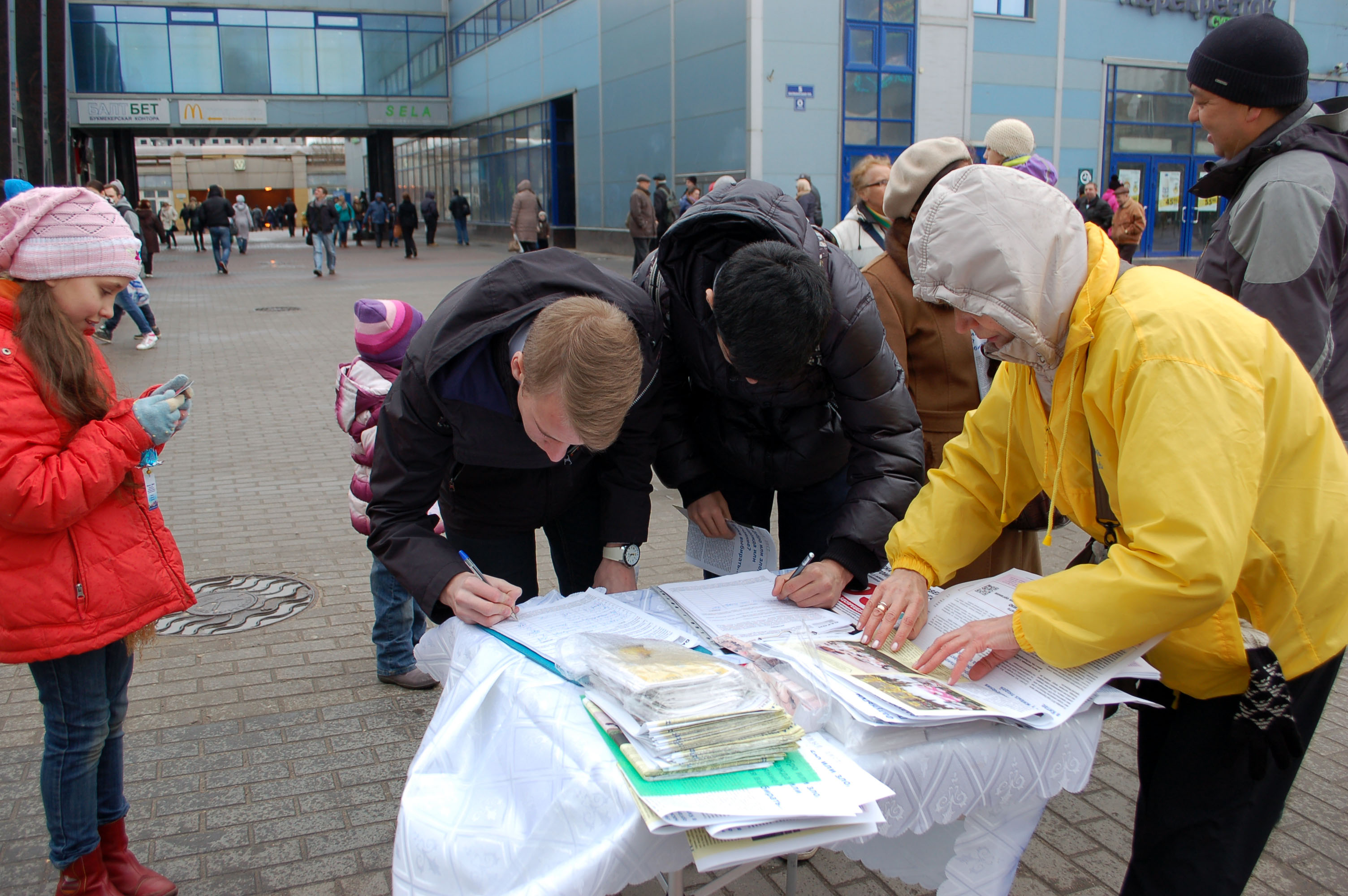 ![]() 俄罗斯圣彼得堡波罗的海火车站附近,人们签名支持法轮功反迫害 |
