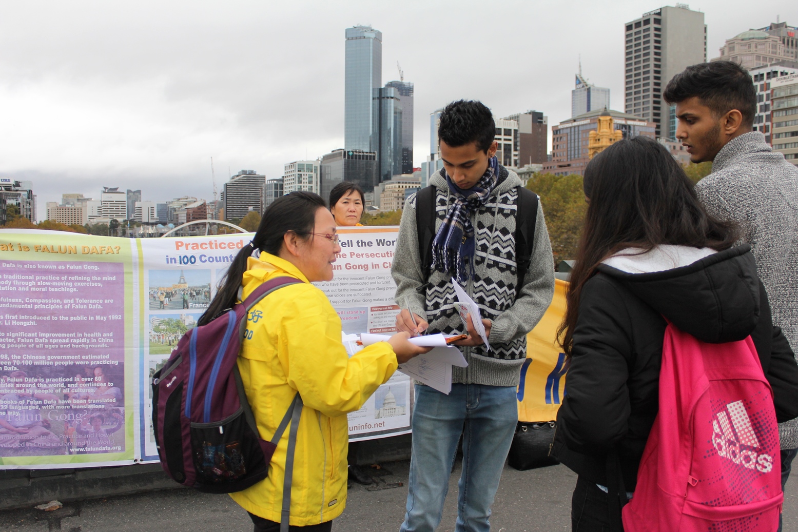 当天适逢澳洲的公共假日——澳纽军团日,缅怀纪念在历次战事中为保卫祖国、维护和平而捐躯的澳洲英雄们。上午一年一度的大游行之后,王子桥畔依然熙熙攘攘,墨尔本法轮功学员的活动引起了许多市民和游人的关注,许多路人停下脚步倾听学员们讲述真相,并签名呼吁停止迫害。三个小时之内,超过七百人在征签表上签了名。
