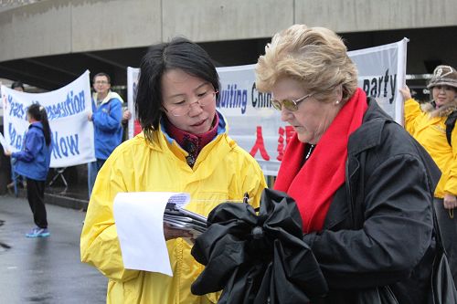 一位华人老太太乘坐电车经过王子桥,看到法轮功学员的“勇气长城”后,立即下车,慢慢走过所有横幅。她和在征签的法轮功学员田女士谈了许久,她告诉田女士:“我还没有到目的地,但看到你们,我就下来了,这是我支持你们的方式。现在很多中国人都不关心这个事情,令人悲哀。”