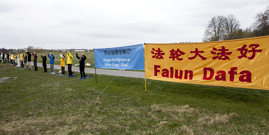 有两位在该路段的协调交通秩序的瑞典中年男士,当学员们的横幅刚刚摆放好,便上前了解真相,他们对法轮功学员和平反迫害表示赞同、支持。其中一位瑞典男士还请学员当即演示功法,看完后他马上问:“在哪儿能炼这个功,我也要炼法轮功!”