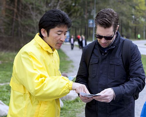 还有一位路过的瑞典的中年人驻足与学员攀谈起来。原来,他早就知道中共迫害法轮功的事实真相,他并告诉学员,他有一位朋友从前抽烟、喝酒,很糟糕的样子,突然有一天再见到他时简直认不出来了,整个人精神焕发,看起来至少年轻了年轻了十多岁。原来他的朋友炼了法轮功。他说:“我知道这是最好的功法,那时我就想炼,没想到一拖就拖到了现在。请告诉我炼功的具体地点好吗,这次我一定要炼了!”