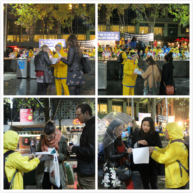 墨尔本法轮功学员冒雨在市中心城市广场举行烛光守夜活动